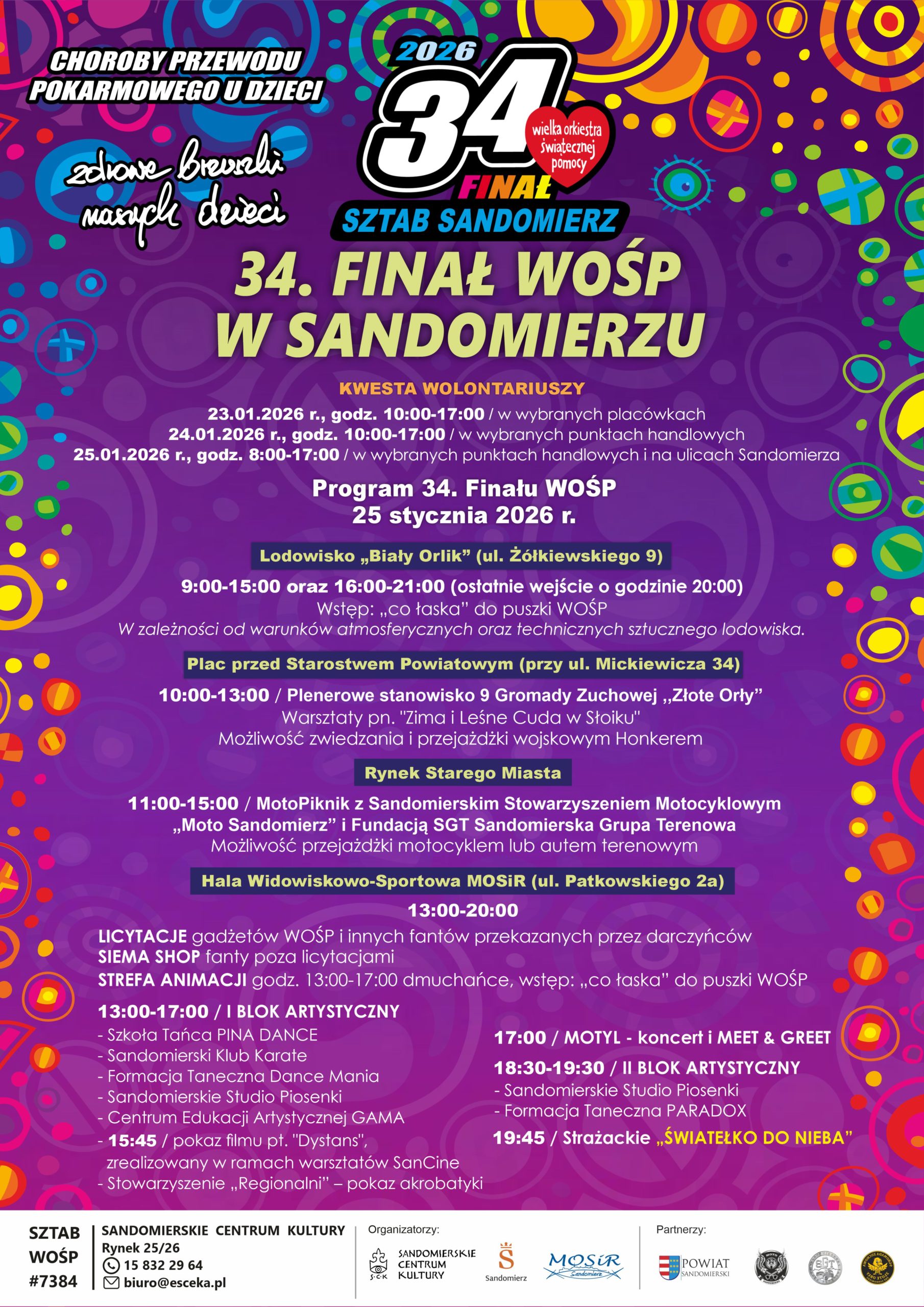 W niedzielę, 25 stycznia 2026 roku w Hali Widowiskowo-Sportowej MOSiR w Sandomierzu przy ul. A. Patkowskiego 2a odbędzie się 34. Finał Wielkiej Orkiestry Świątecznej Pomocy. Wydarzenie rozpocznie się o godz. 13:00.