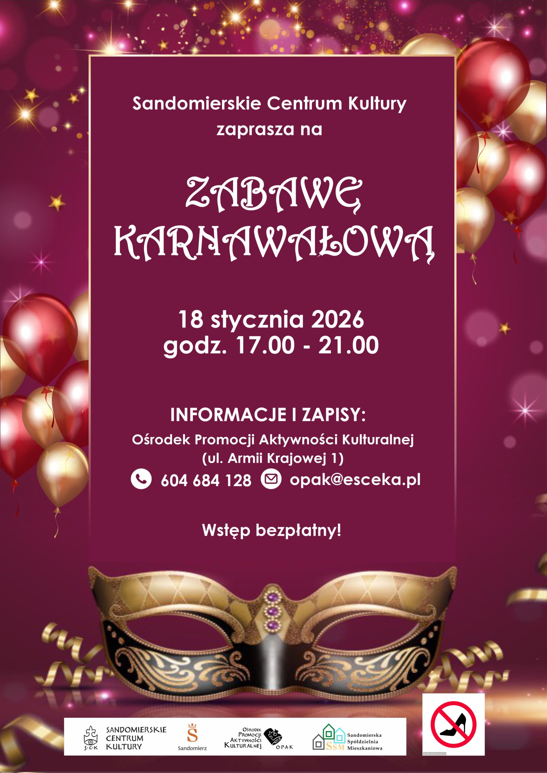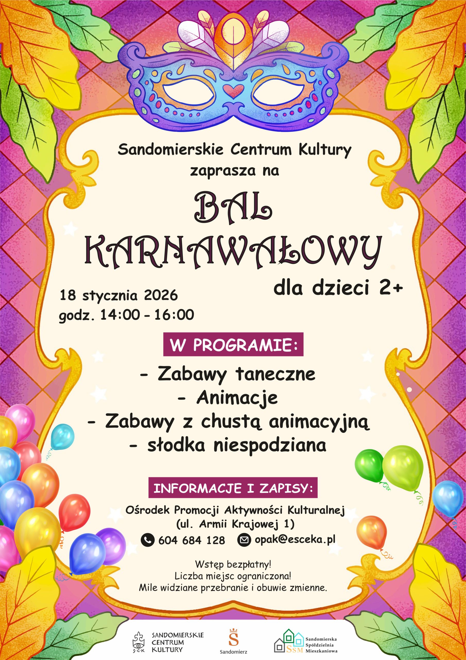 Ośrodek Promocji Aktywności KulturalnejZapraszamy do udziału w Balach Karnawałowych, przygotowanych zarówno dla dzieci, jak i dla dorosłych, które odbędą sie 18 stycznia (niedziela) 2026 roku w Ośrodku Promocji Aktywności Kulturalnej w Sandomierzu.