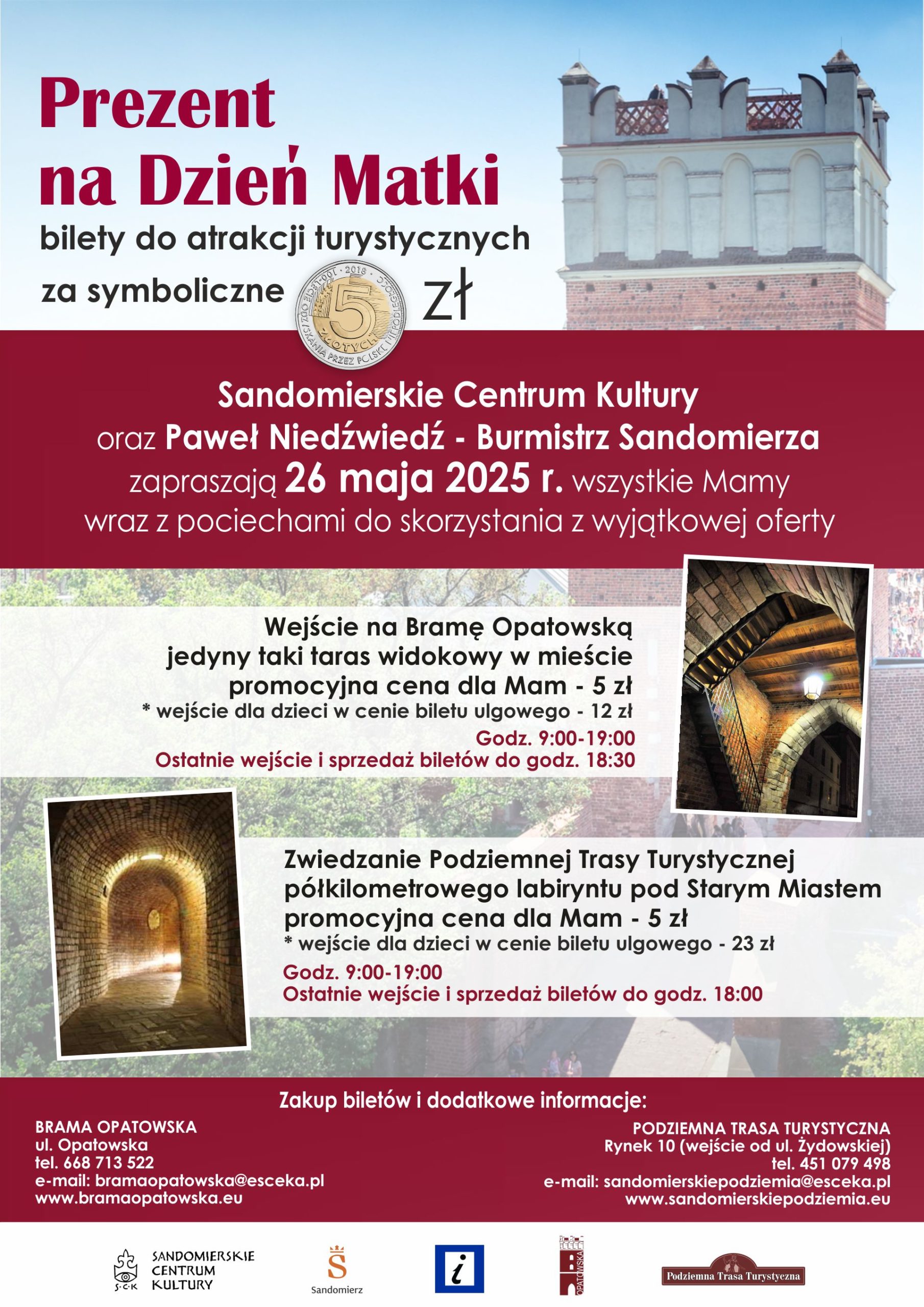 – zwiedzanie Podziemnej Trasy Turystycznej – półkilometrowego labiryntu prowadzącego pod Starym Miastem w promocyjnej cenie dla Mam: 5 zł