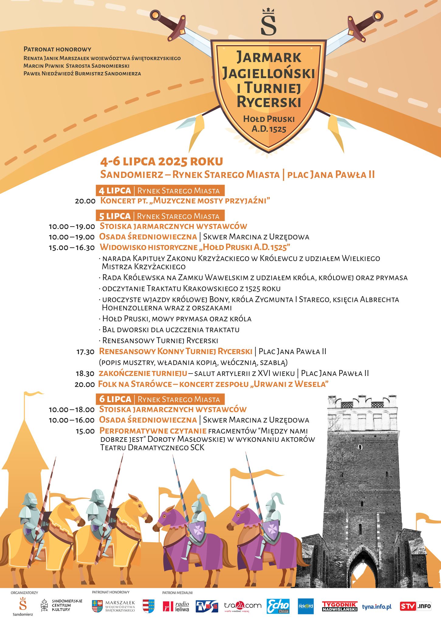 Nie zabraknie imponujących widowisk historycznych przygotowanych z rozmachem i dbałością o szczegóły przez Chorągiew Rycerstwa Ziemi Sandomierskiej, tym bardziej, że w roku 2025 przypada 500. rocznica złożenia Hołdu Pruskiego – wydarzenia o wielkim znaczeniu w historii Rzeczypospolitej. Z tej okazji Chorągiew Rycerstwa Ziemi Sandomierskiej przygotowała okazałą rekonstrukcję hołdu pruskiego – widowisko, które przeniesie widzów do 1525 roku i ukazuje moment złożenia przysięgi przez Albrechta Hohenzollerna królowi Zygmuntowi Staremu.