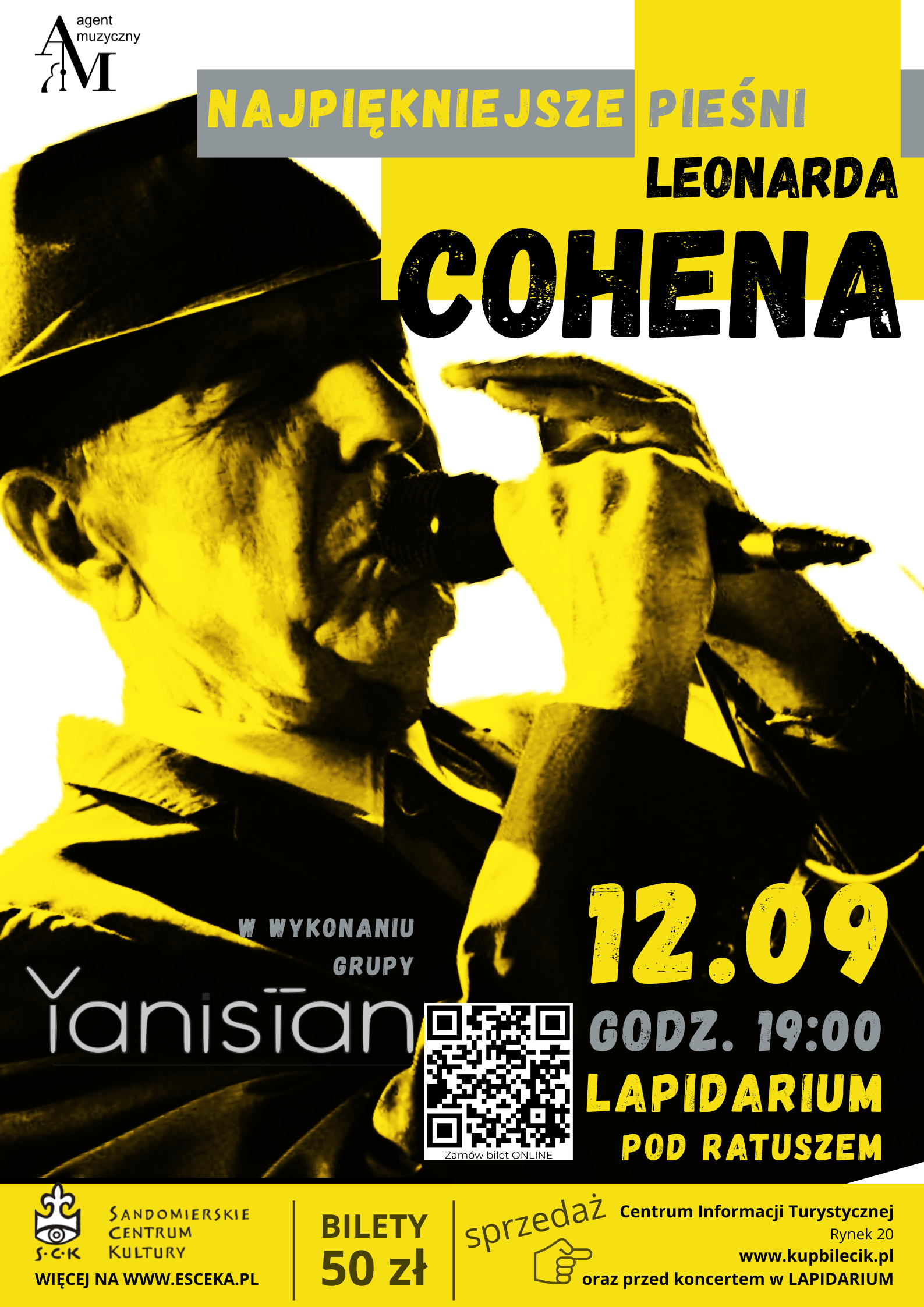 ZapowiedziSandomierskie Centrum Kultury serdecznie zaprasza na koncert zespołu YANISTAN pt. „Najpiękniejsze pieśni Leonarda Cohena”, który odbędzie się 12 września 2025 r. o godz. 19:00 w Lapidarium pod Ratuszem.