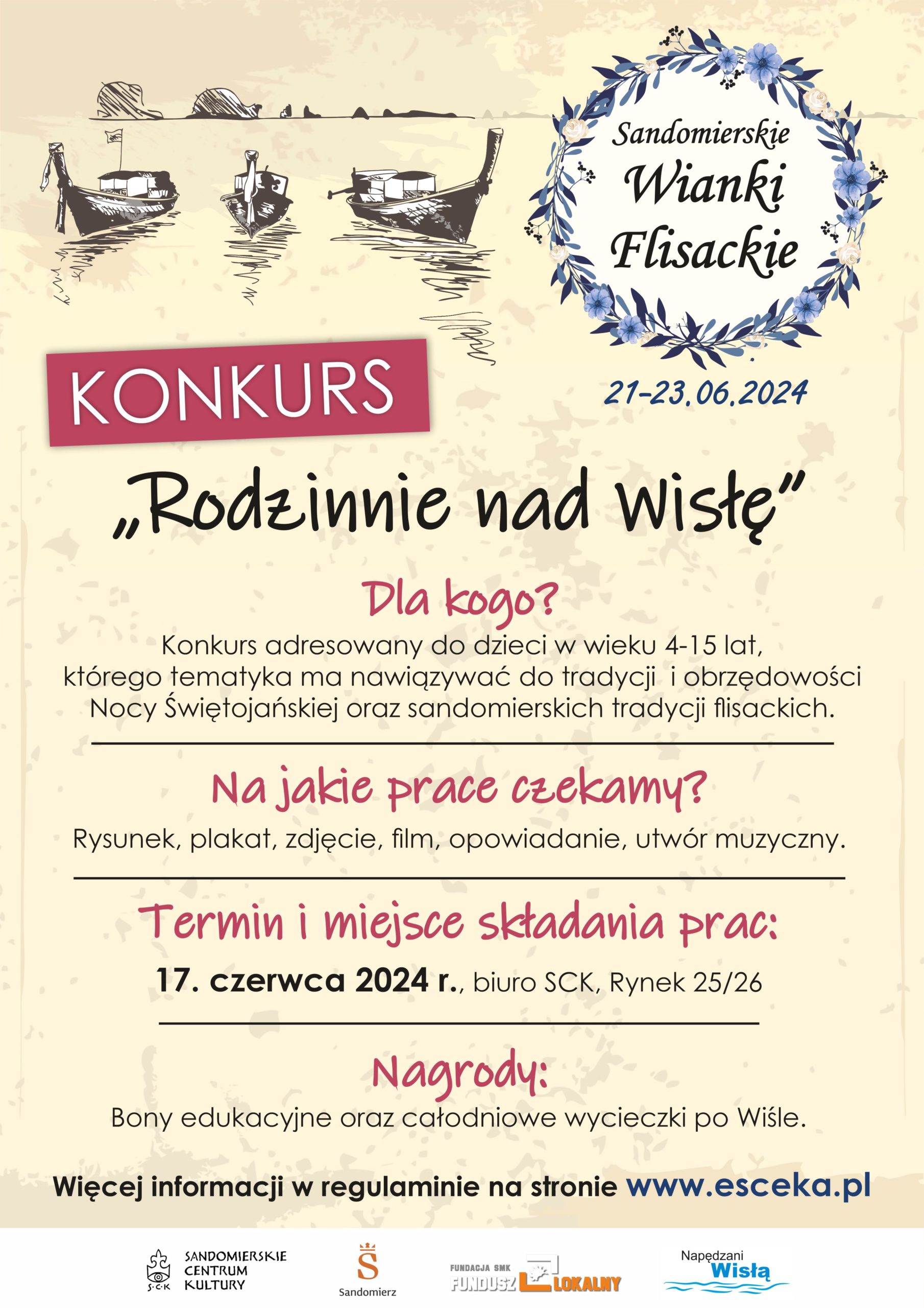 Serdecznie zapraszamy dzieci i młodzież (4-15 lat) do wzięcia udziału w konkursie artystycznym pt. „Rodzinnie nad Wisłę”, który odbędzie się w ramach Sandomierskich Wianków Flisackich.