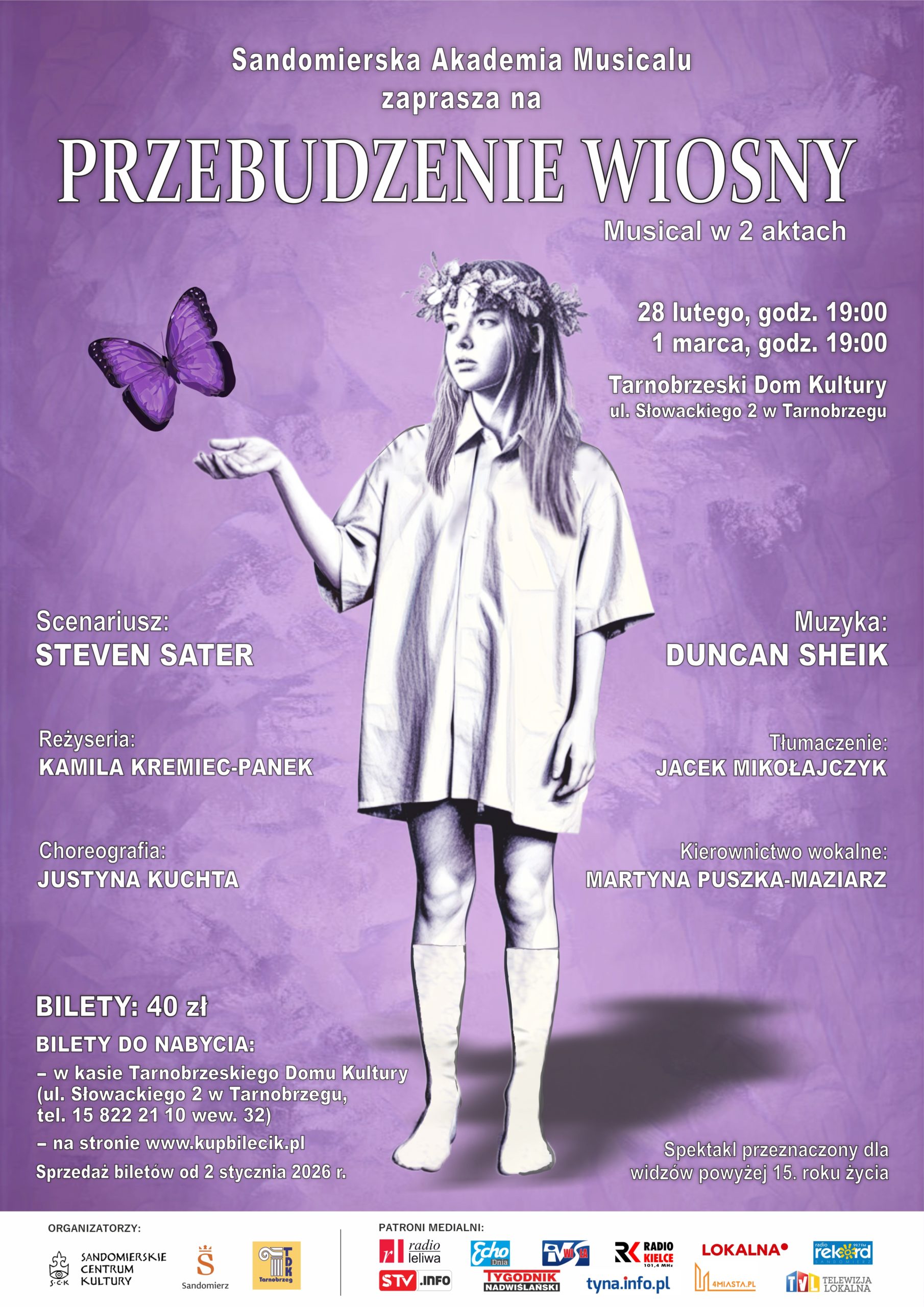 Sandomierska Akademia Musicalu zaprasza na wznowiony po 9 latach, wyjątkowy musical rockowy z muzyką na żywo pt. „Przebudzenie Wiosny”! Spektakle premierowe odbędą się 28 lutego i 1 marca 2026 o godz. 19:00 w Tarnobrzeskim Domu Kultury.