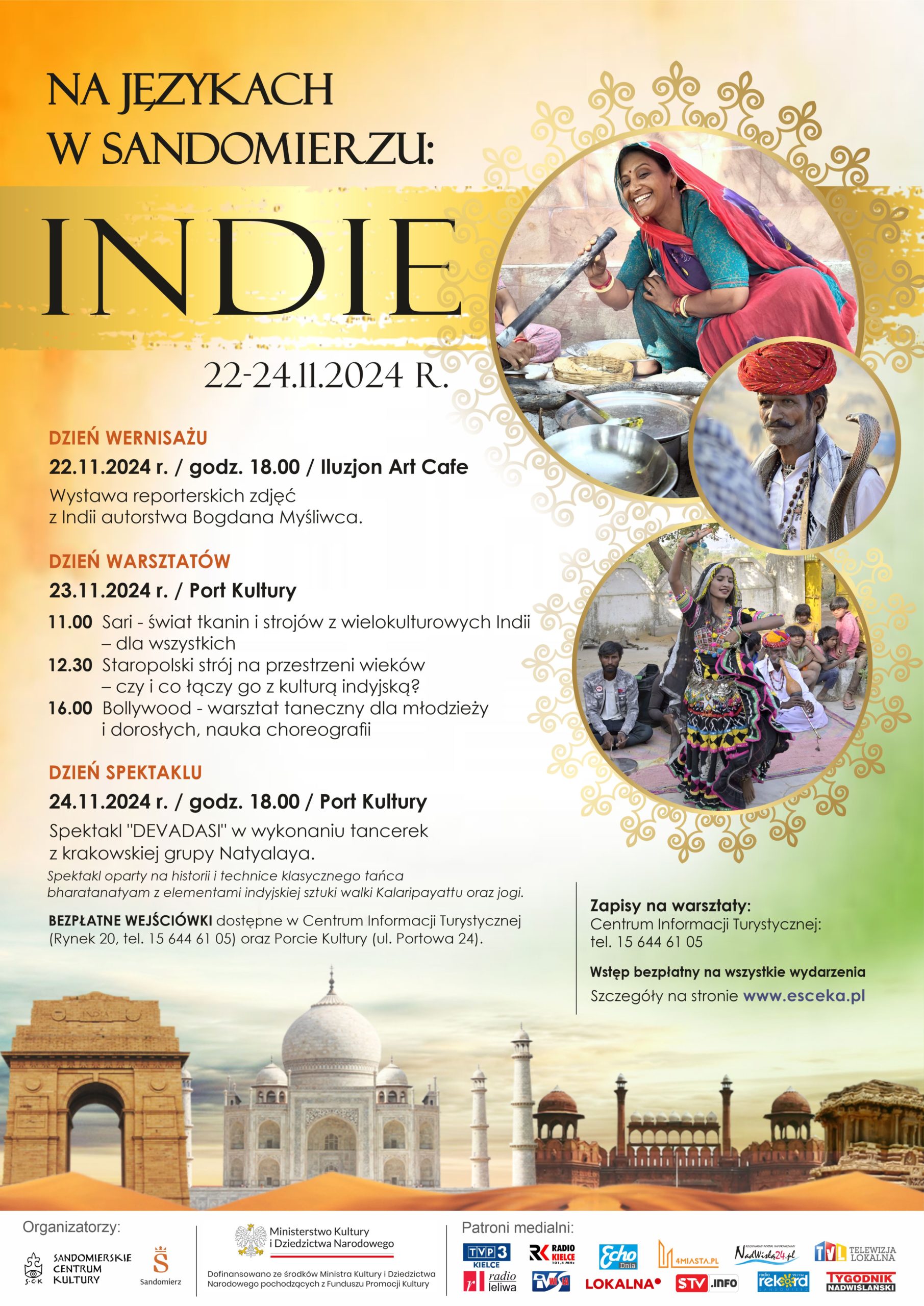 Sandomierskie Centrum Kultury oraz Urząd Miejski w Sandomierzu zapraszają na wyjątkowe wydarzenia realizowane w ramach projektu pn. „Na językach w Sandomierzu: Indie”. Celem tego przedsięwzięcia jest edukacja międzykulturowa i międzypokoleniowa – chcemy poprzez przybliżenie kultury Indii uwrażliwić uczestników na różnice i podobieństwa w naszych kulturach oraz zwiększyć świadomość społeczną w tej kwestii. Autorką i koordynatorką projektu jest Joanna Gajda.