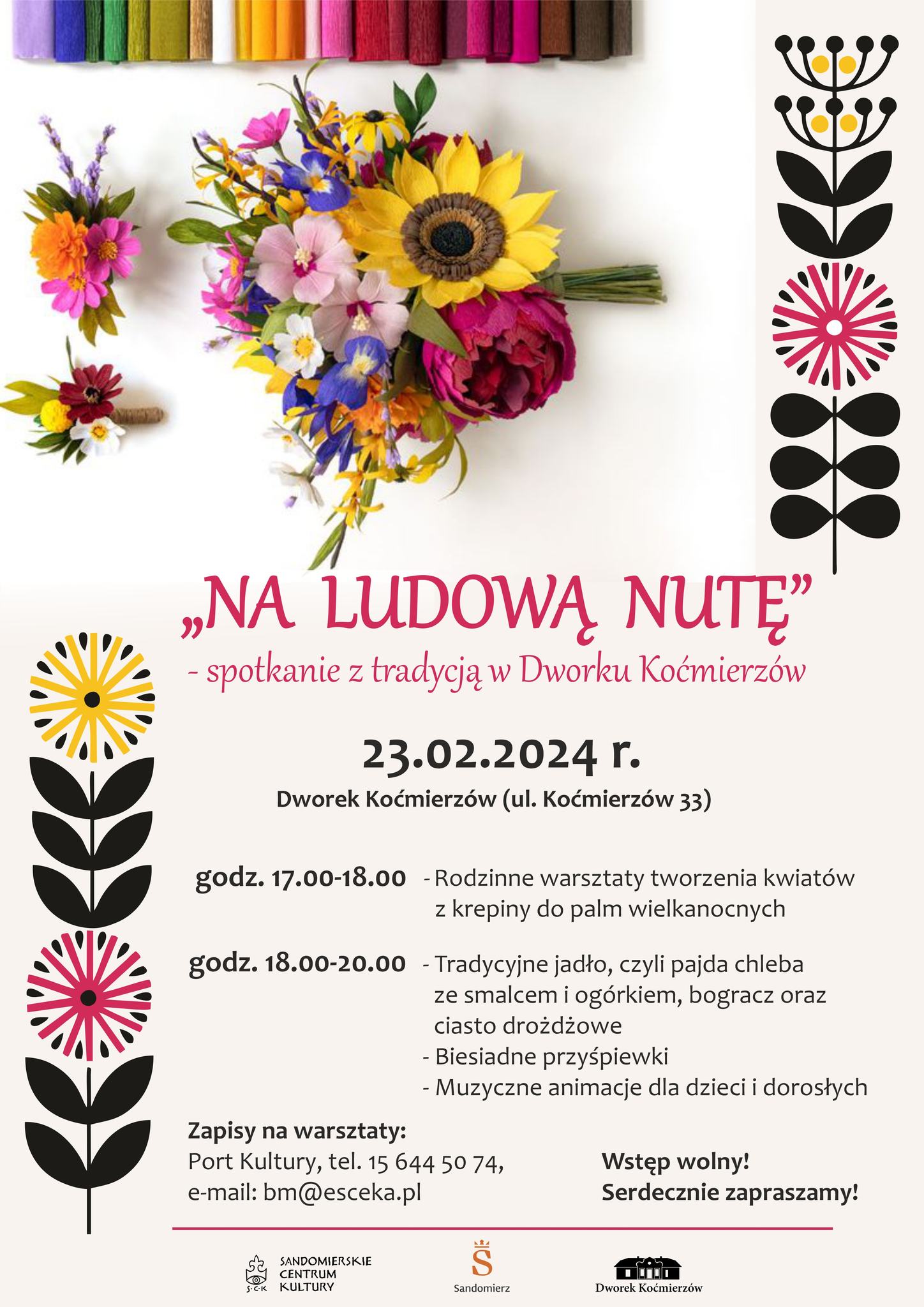 OgłoszeniaSandomierskie Centrum Kultury serdecznie zaprasza na wydarzenie pt. „Na ludową nutę”- spotkanie z tradycją w Dworku Koćmierzów, które odbędzie się 23.02.2024 r. w Dworku Koćmierzów (ul. Koćmierzów 33).