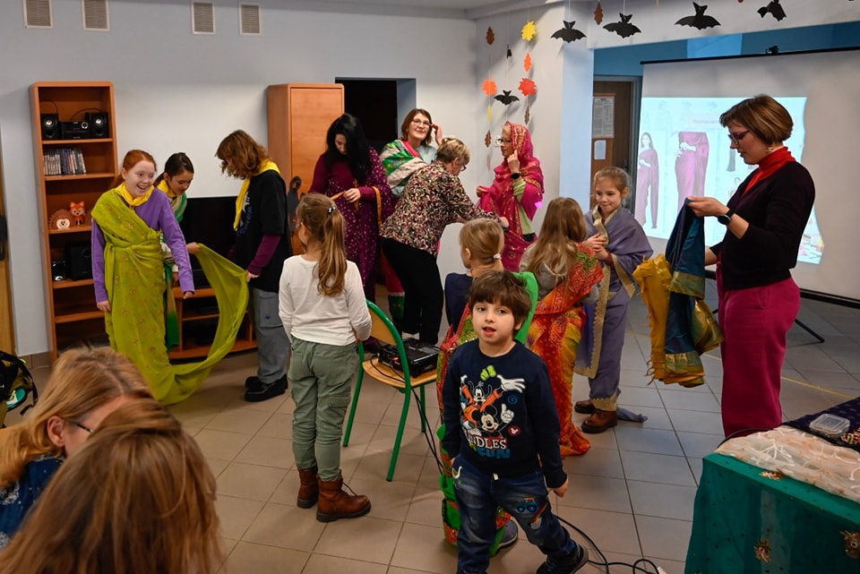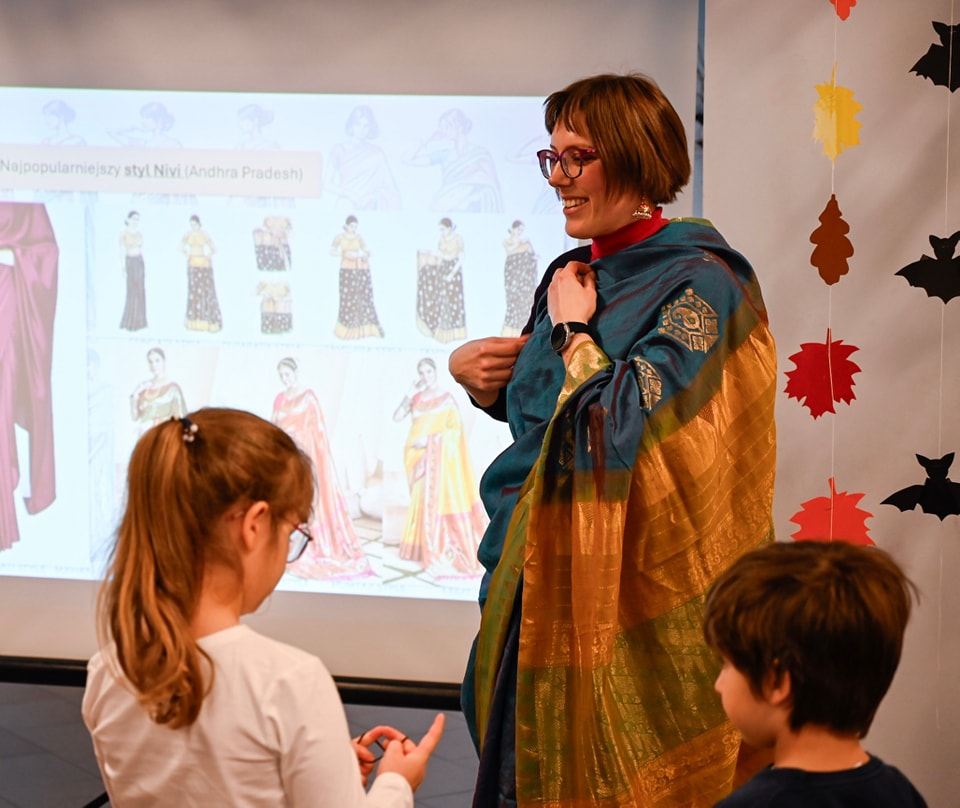 Uczestnicy mieli okazję wziąć udział w fascynujących warsztatach. Warsztaty „Sari – świat tkanin i strojów z wielokulturowych Indii” zachwyciły bogactwem materiałów i technik, pozwalając na głębsze zrozumienie indyjskiej sztuki ubierania się. Z kolei zajęcia pt. „Staropolski strój na przestrzeni wieków – czy i co łączy go z kulturą indyjską?” okazały się zaskakującym odkryciem, ujawniającym interesujące powiązania między dawną modą polską a indyjską.