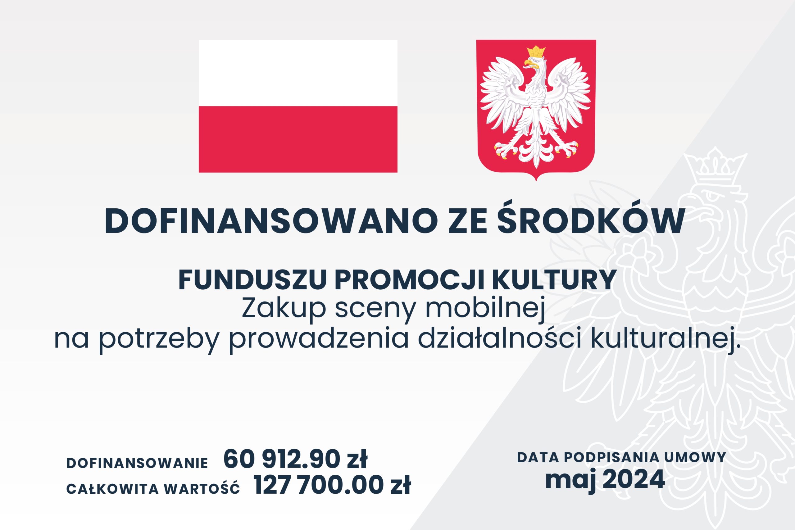 W grudniu 2024 zakończyliśmy realizację projektu pt. ” Zakup sceny mobilnej na potrzeby prowadzenia działalności kulturalnej”, który uzyskał dofinansowanie w kwocie 68 000,00 zł ze środków Ministra Kultury i Dziedzictwa Narodowego pochodzących z Funduszu Promocji Kultury – państwowego funduszu celowego, w ramach programu rządowego „Infrastruktura Domów Kultury” realizowanego przez Narodowe Centrum Kultury.