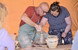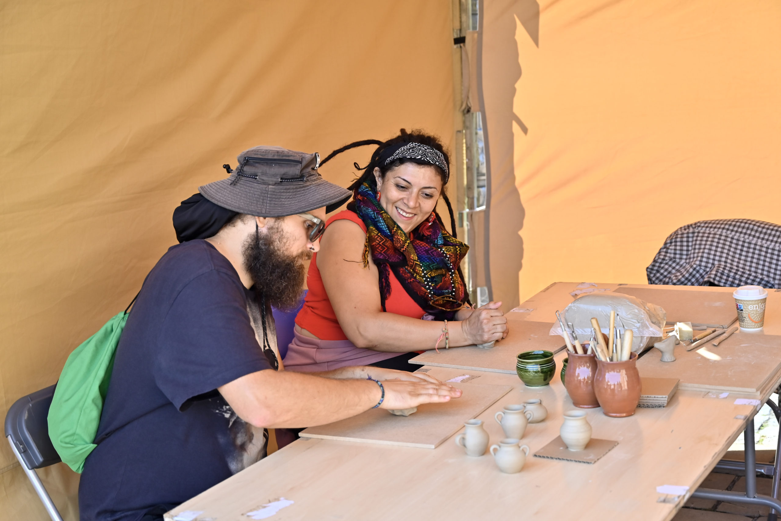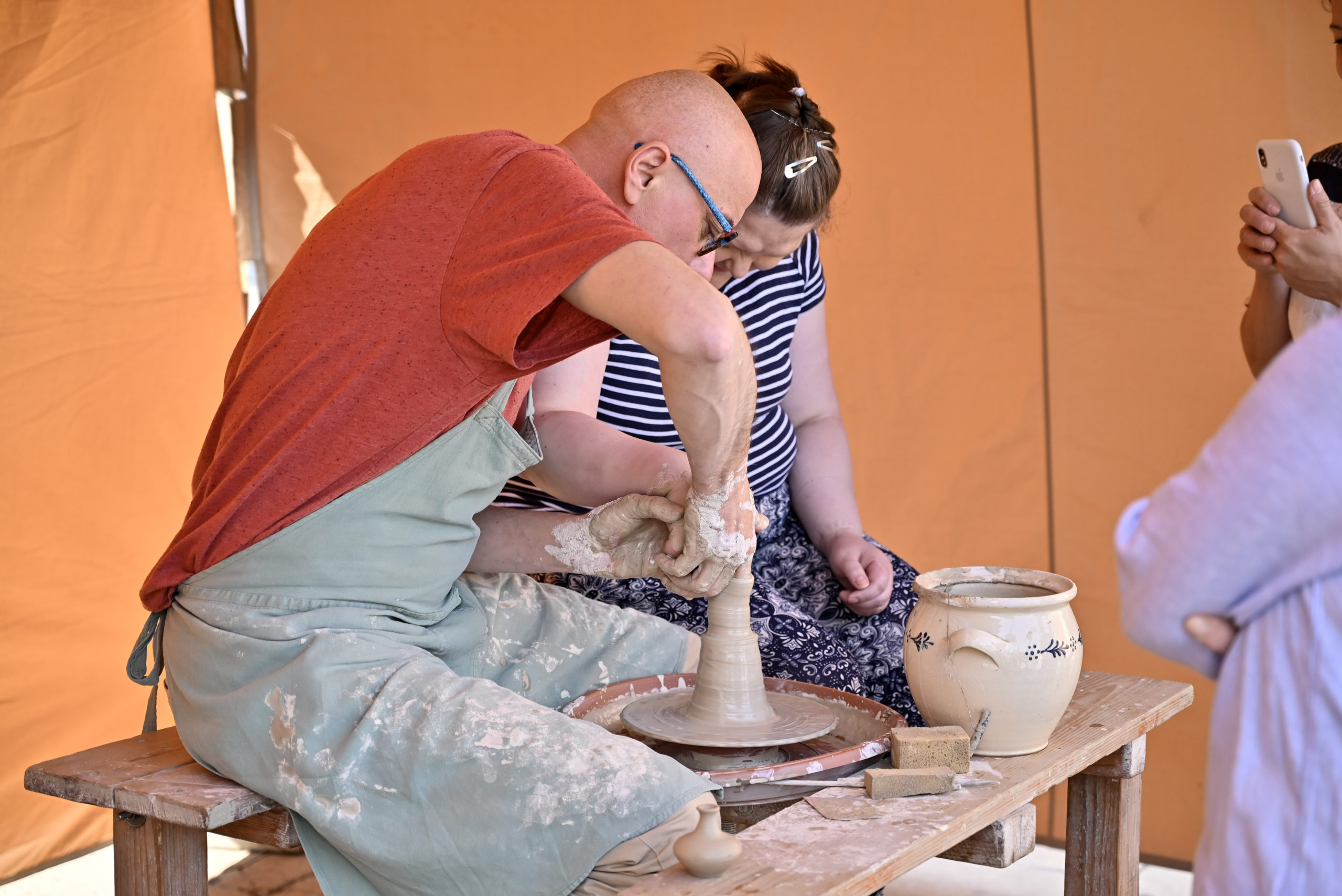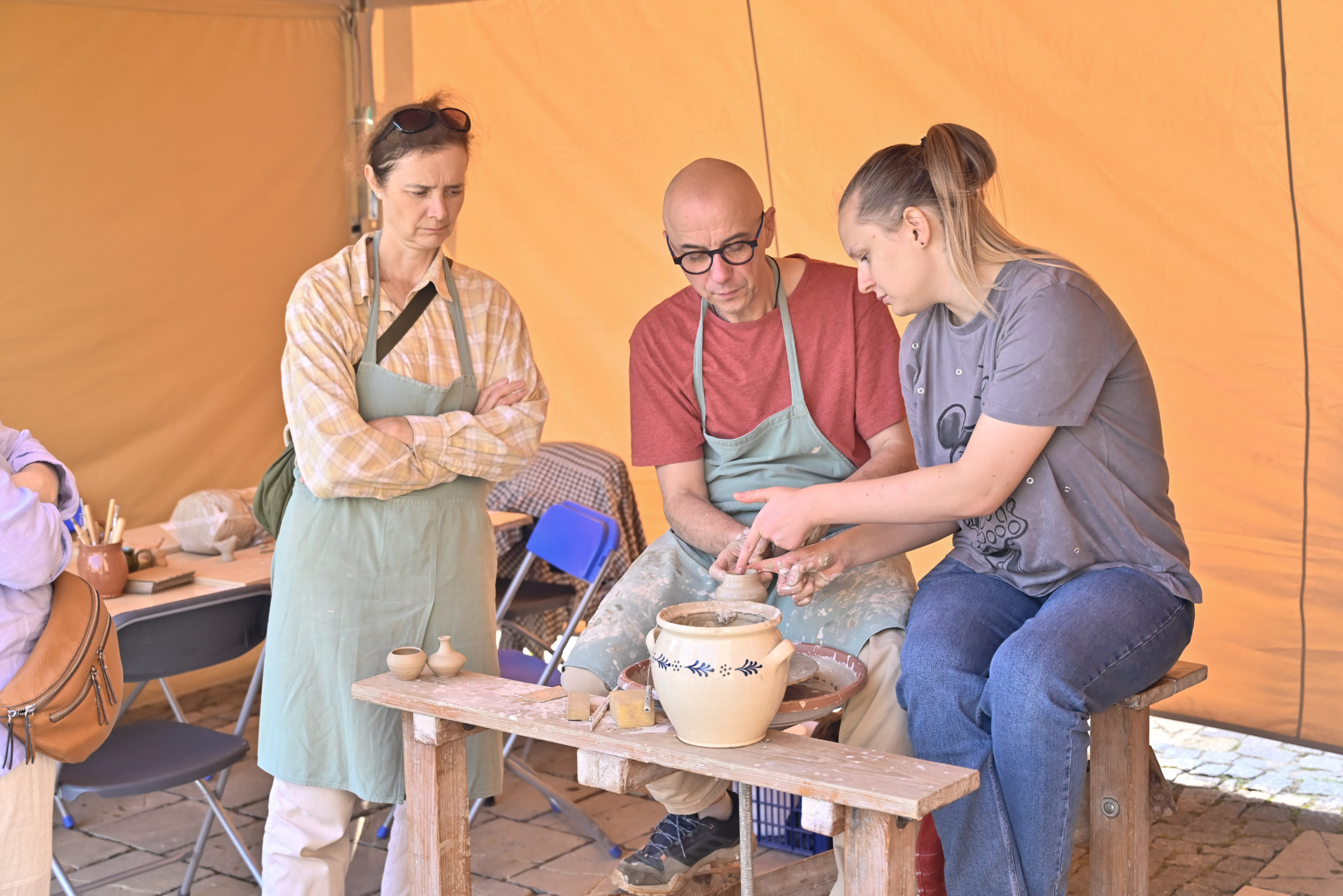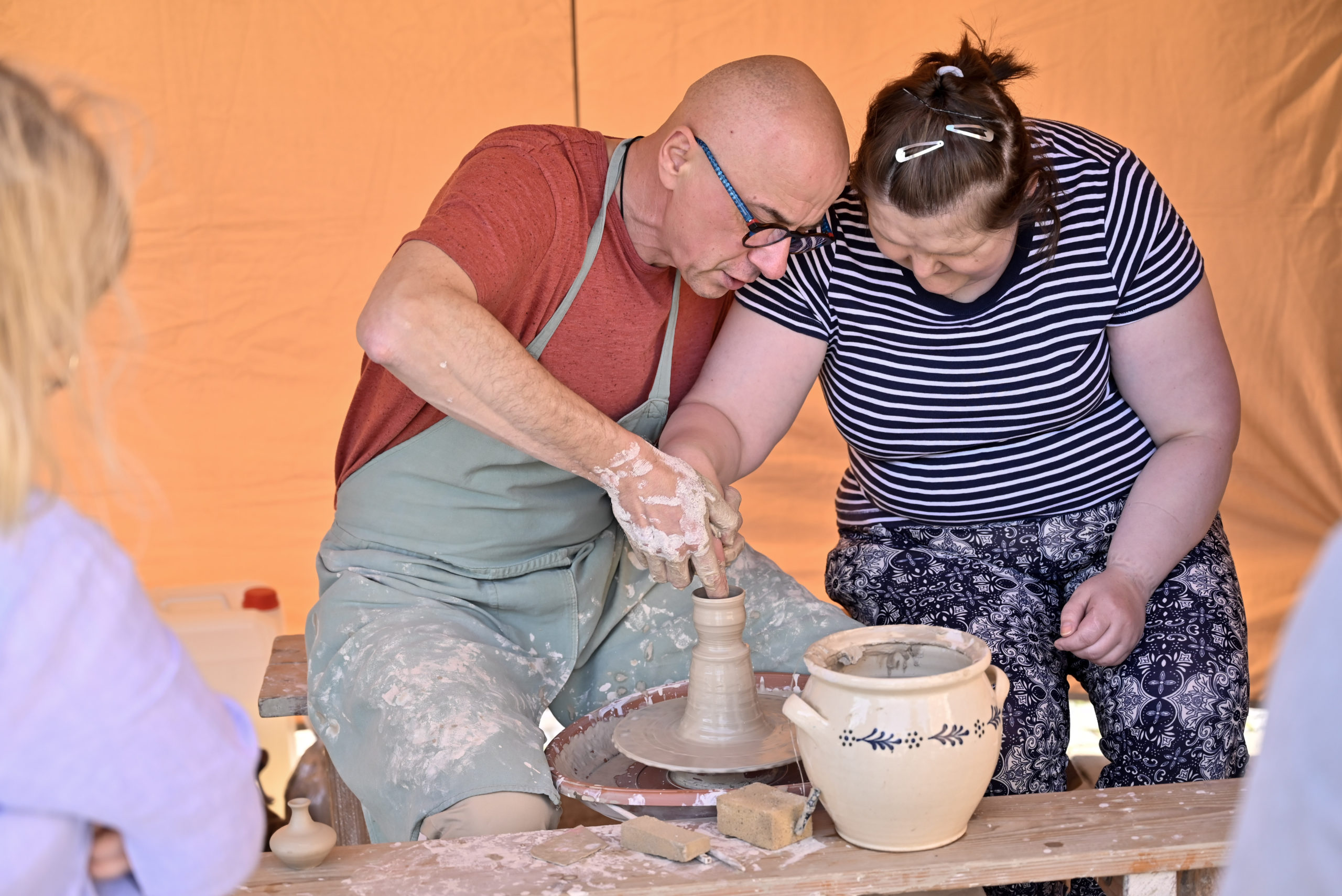 Pierwszym punktem programu był pokaz toczenia na kole garncarskim „Formy z natury”, zrealizowany w ramach projektu „Ceramika z duszą – dziedzictwo Kazimierza Radulskiego”. Monika i Robert Jehn-Olszewscy z pracowni JehnCeramics wprowadzili publiczność w świat gliny, prezentując tajniki tradycyjnego garncarstwa. Uczestnicy mogli nie tylko obserwować pracę mistrzów, ale także samodzielnie spróbować sił w tworzeniu naczyń i unikatowych form.