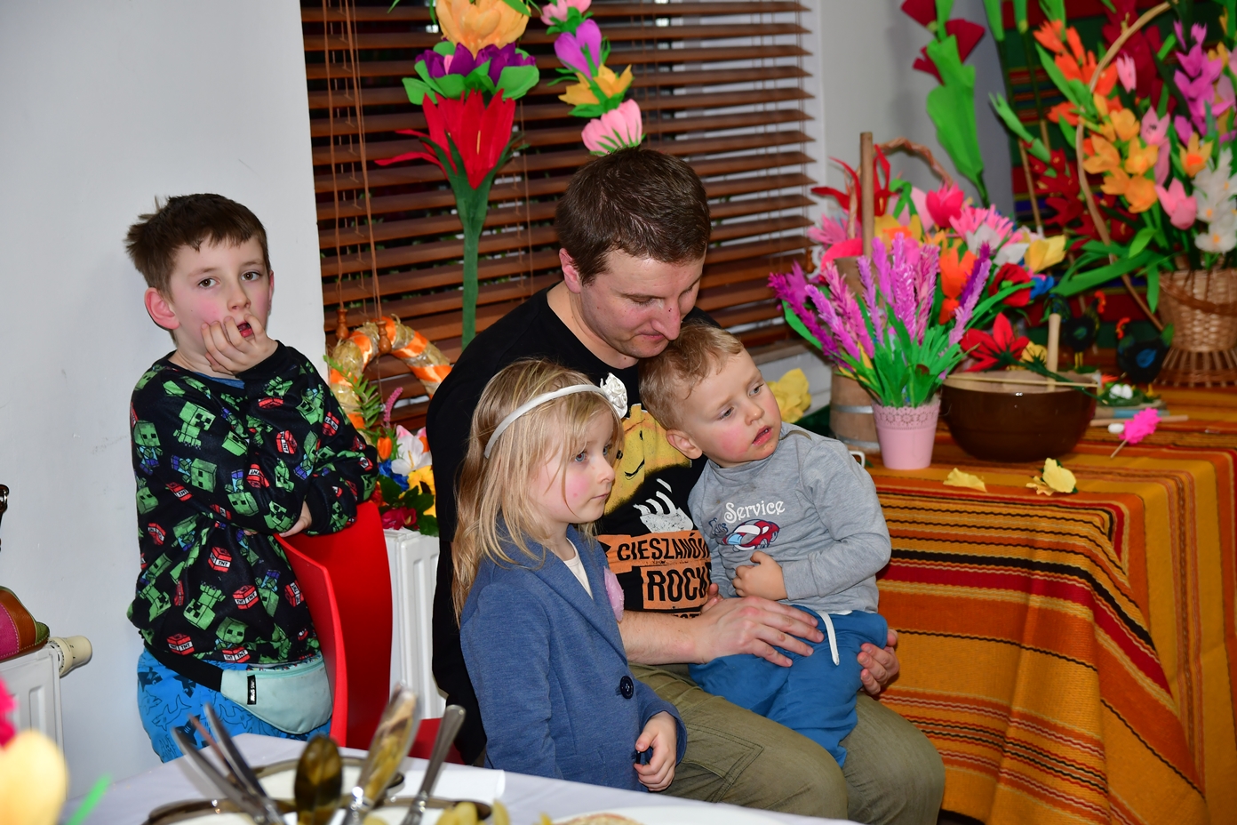 Wystrój Dworku Koćmierzów był utrzymany w tematyce spotkania i cieszył oko przybyłych. Pasiaste wełniane kilimy, lniane serwety ręcznie haftowane w kwiaty, maselnica, misy, łyżki i chochle drewniane, bukiety kwiatów z bibuły i bogato uplecione palmy wielkanocne – wszystko to pozwoliło zebranym poczuć się sielsko i swobodnie.