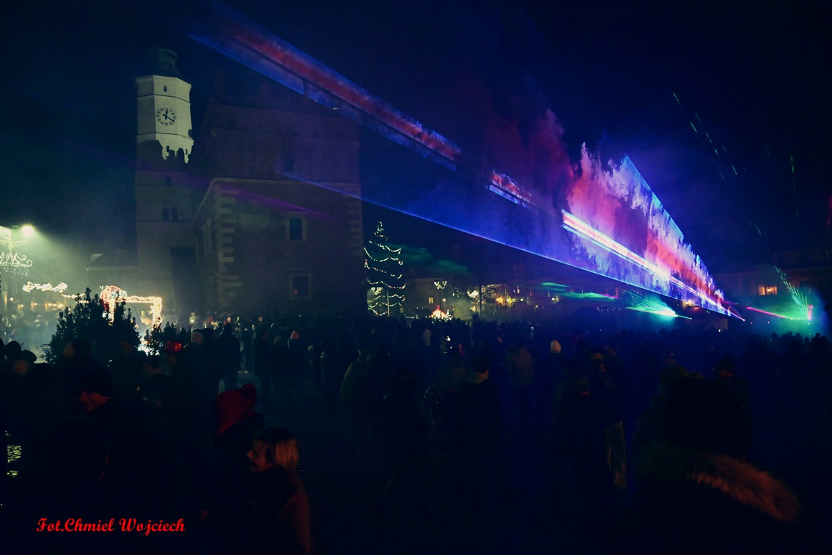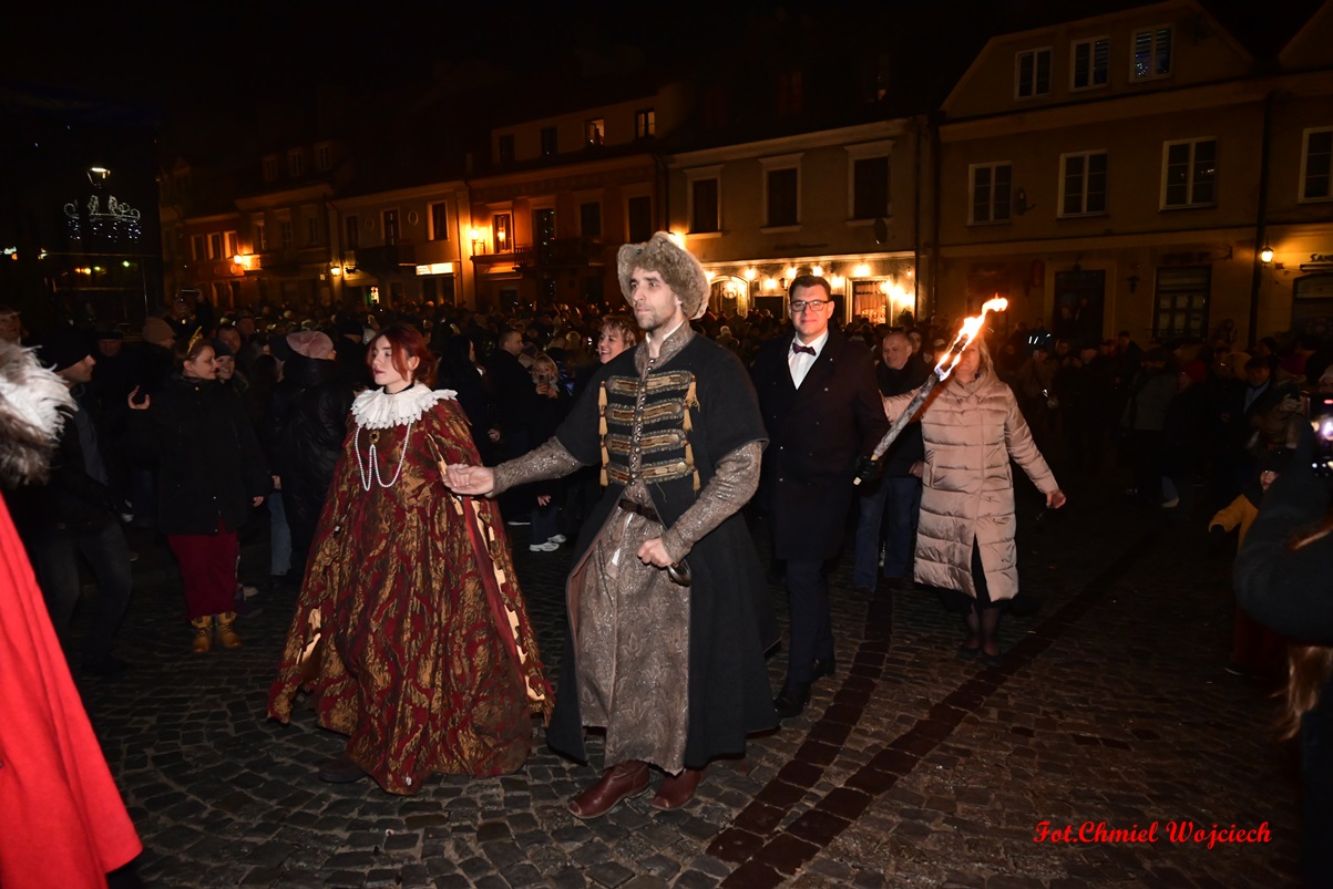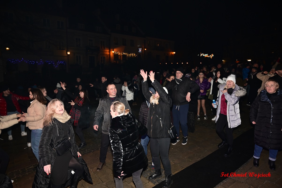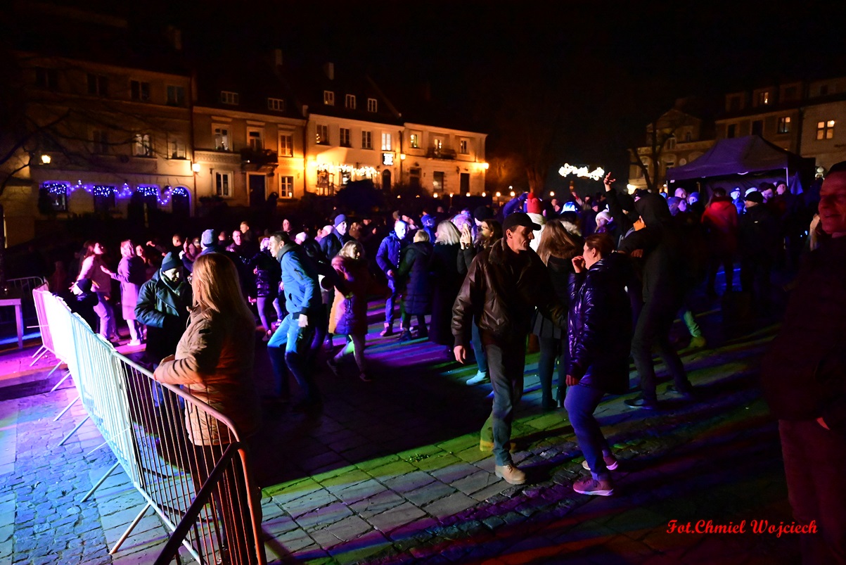 Na kilkanaście minut przed północą swoje życzenia złożyli wszystkim zgromadzonym pan Marcin Marzec, burmistrz Sandomierza, i dyrektor Sandomierskiego Centrum Kultury, pani Kamila Kremiec-Panek. O północy w niebo wystrzeliły kolorowe lasery, tworząc w powietrzu i ścianach kamienic spektakularne noworoczne iluminacje.  O tej samej godzinie nie zabrakło również tradycyjnie tańczonego poloneza- prawdziwej i unikatowej wizytówki sylwestrowego Sandomierza, która rok w rok przyciąga rzesze mieszkańców i turystów! Korowód poprowadziła jak zawsze wspaniała Chorągiew Rycerstwa Ziemi Sandomierskiej, zachwycająca bogactwem strojów, wprawą w tańcu, a także postawą i obyczajem.