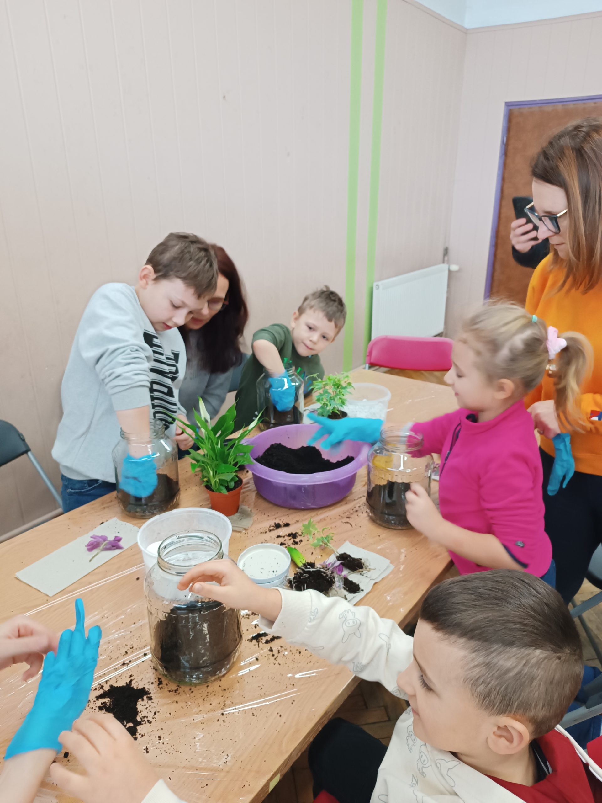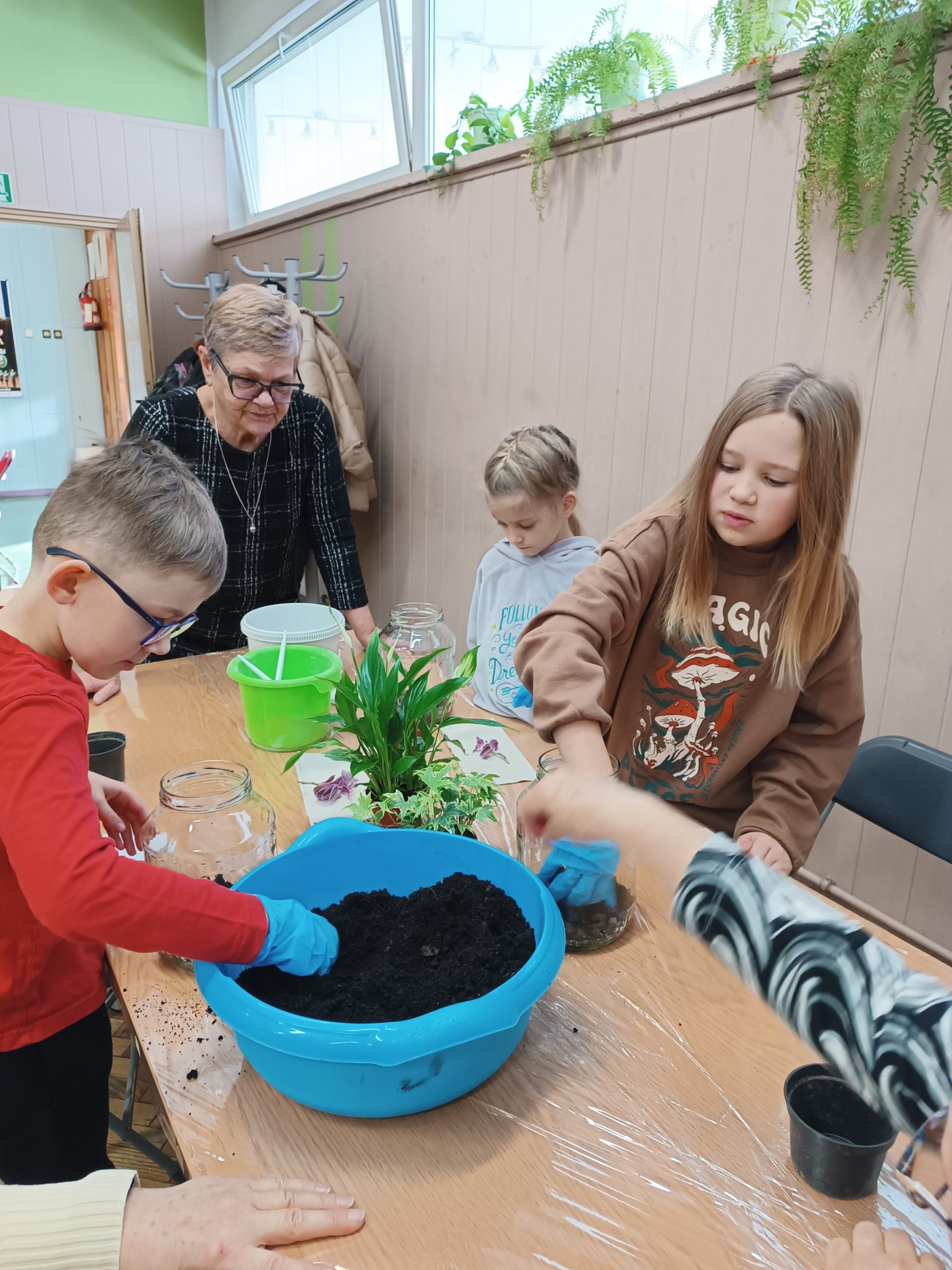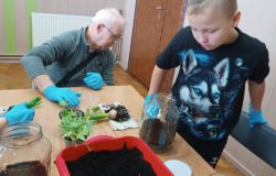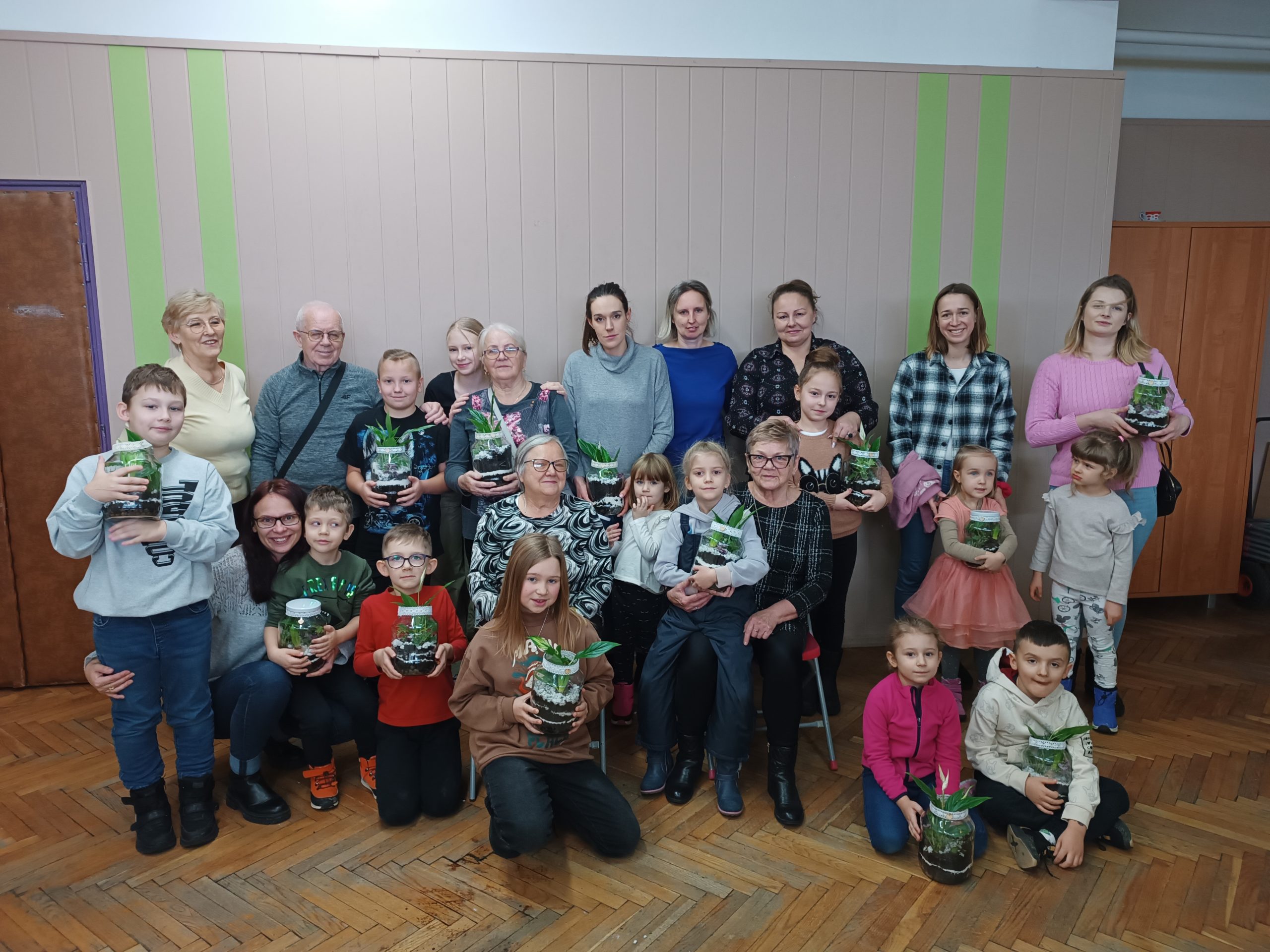 Na zajęcia przybyły Babcie i Mamy, przybyli Dziadziusiowie oraz pełni zapału Wnuczkowie i Wnuczki, aby spędzić wspólnie czas i wykonać prezent z okazji zbliżającego się Dnia Babci i Dziadka. Kompozycje z zielonych roślin i cebulek hiacyntów, z ozdobnymi warstwami z białych kamyczków i piasku, wyglądają zachwycająco.