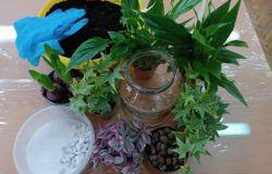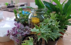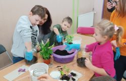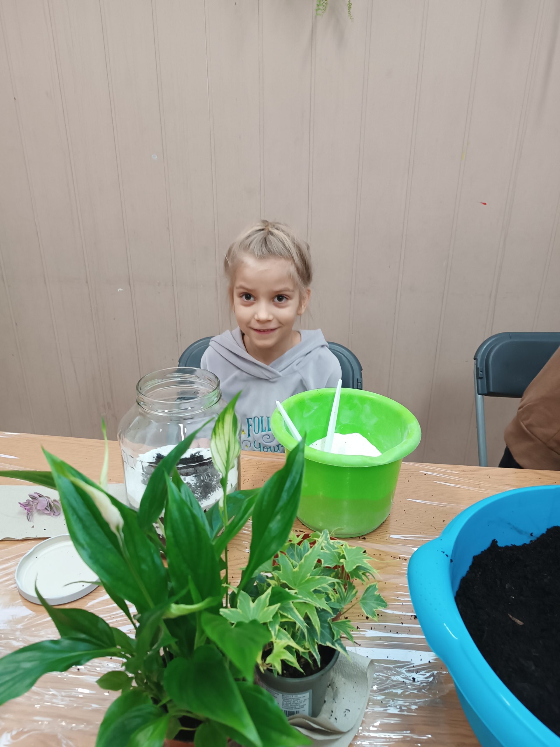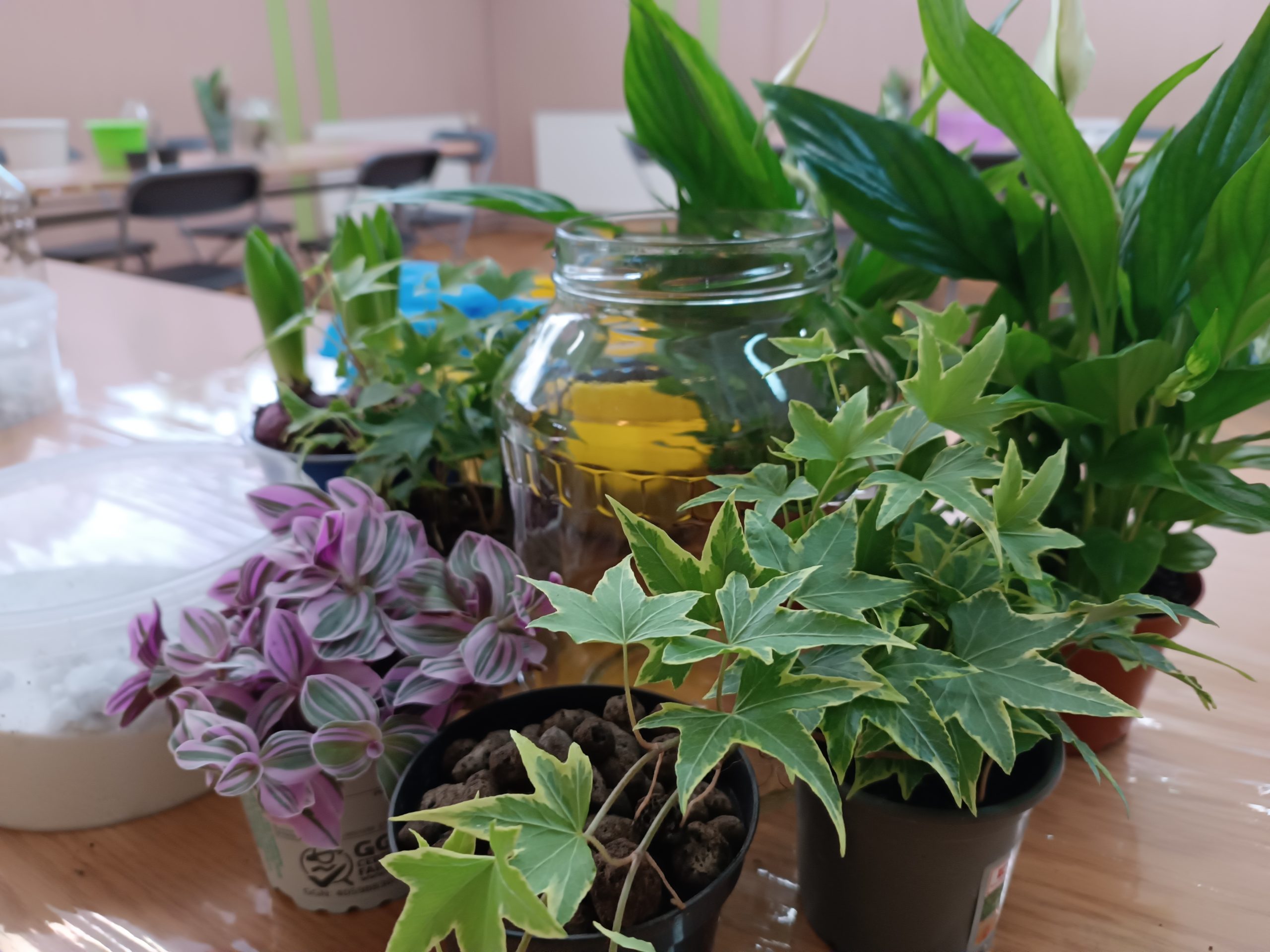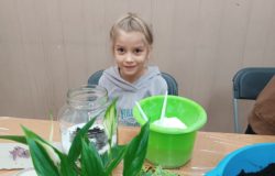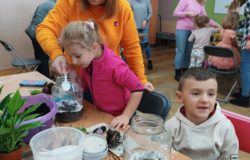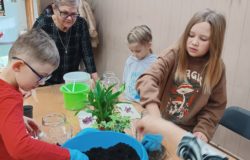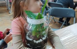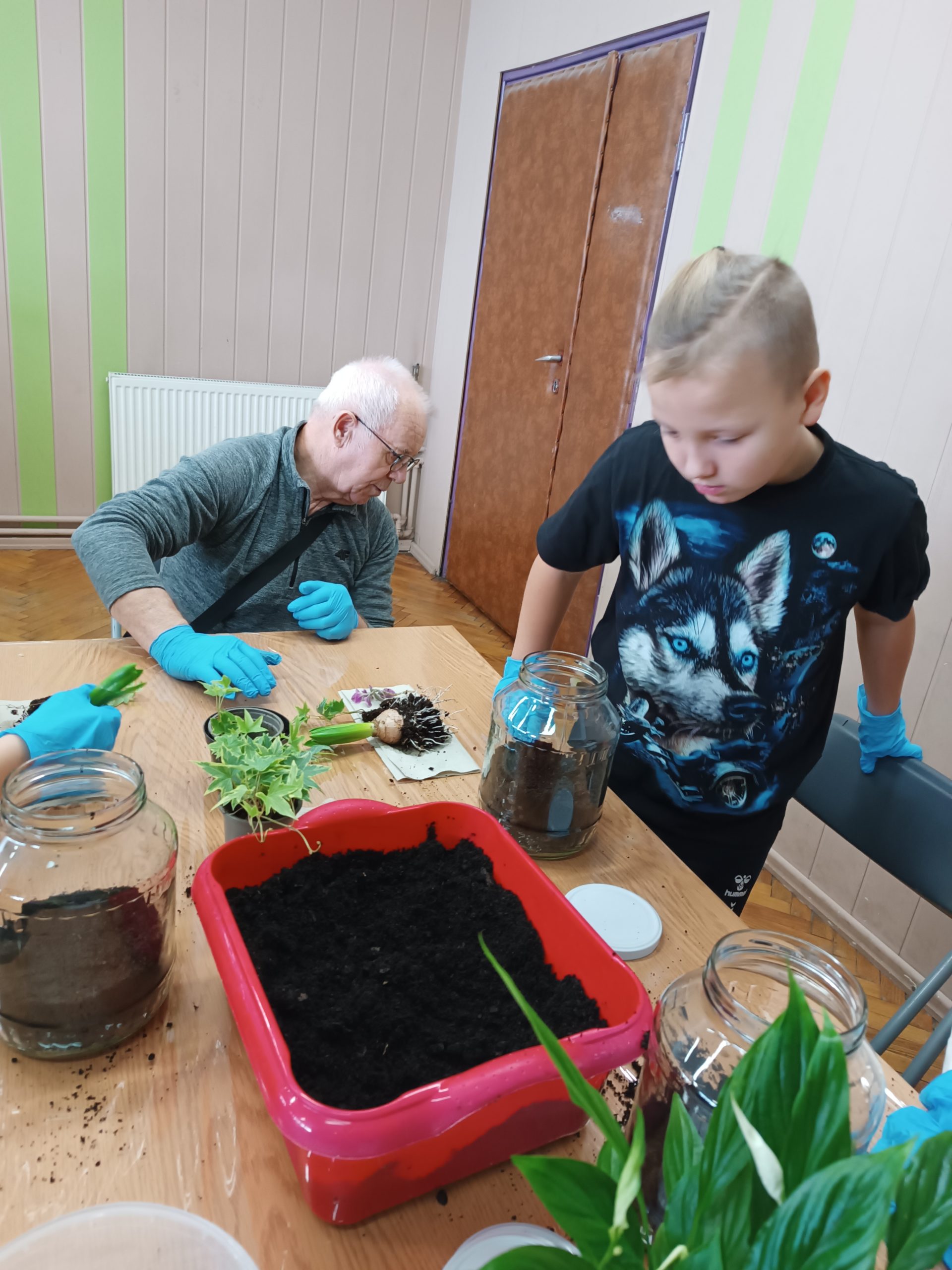 Na zajęcia przybyły Babcie i Mamy, przybyli Dziadziusiowie oraz pełni zapału Wnuczkowie i Wnuczki, aby spędzić wspólnie czas i wykonać prezent z okazji zbliżającego się Dnia Babci i Dziadka. Kompozycje z zielonych roślin i cebulek hiacyntów, z ozdobnymi warstwami z białych kamyczków i piasku, wyglądają zachwycająco.