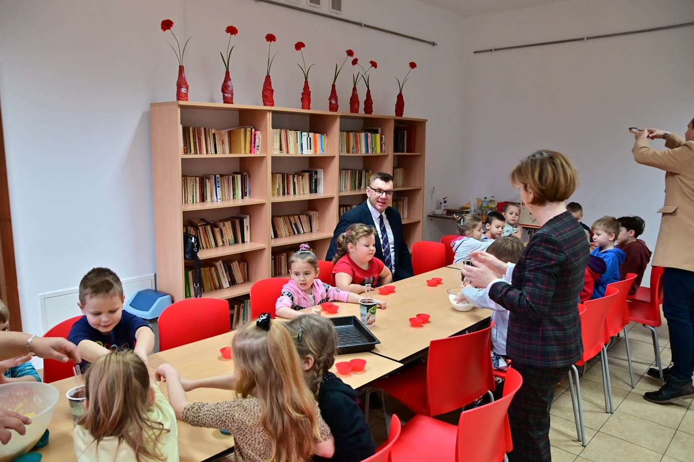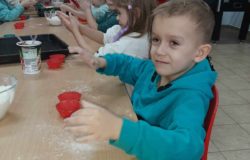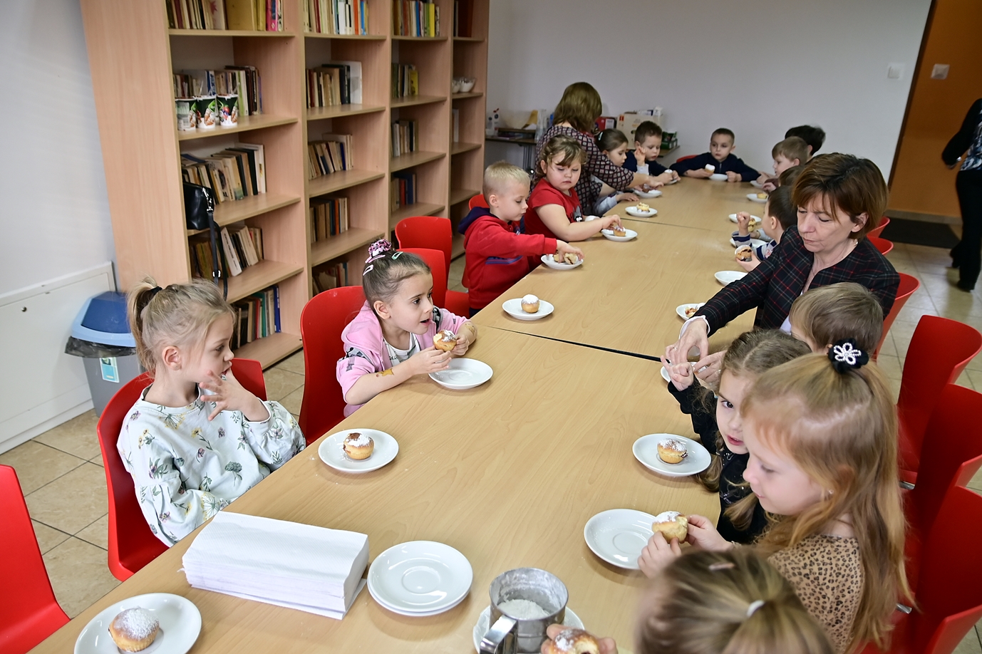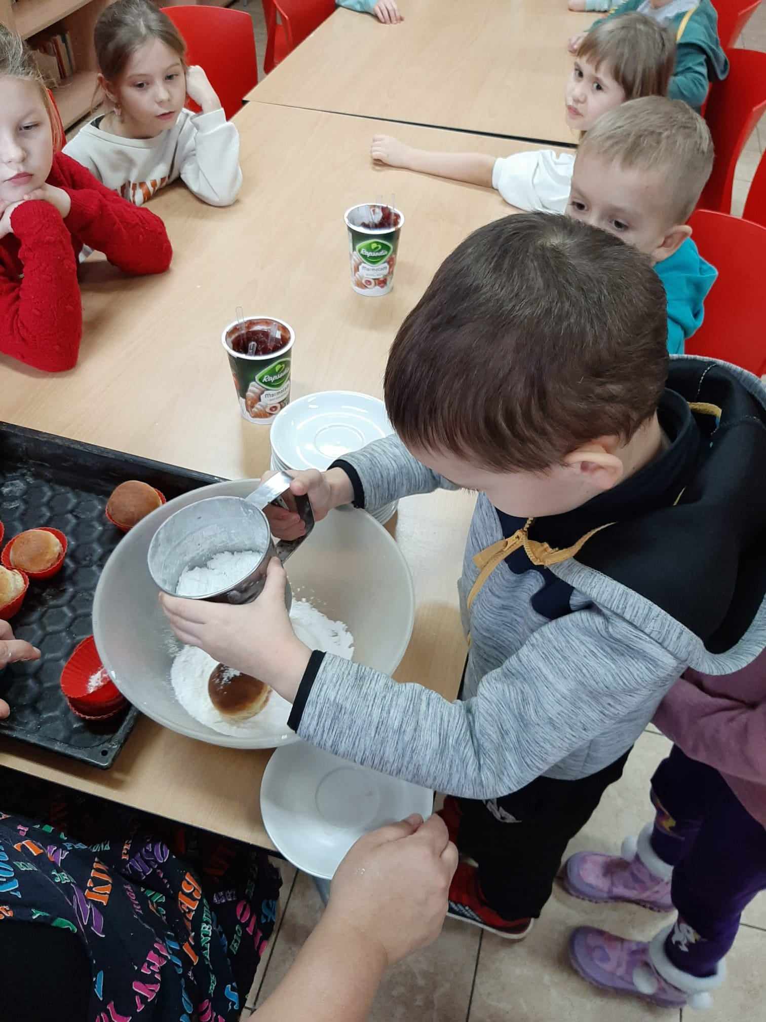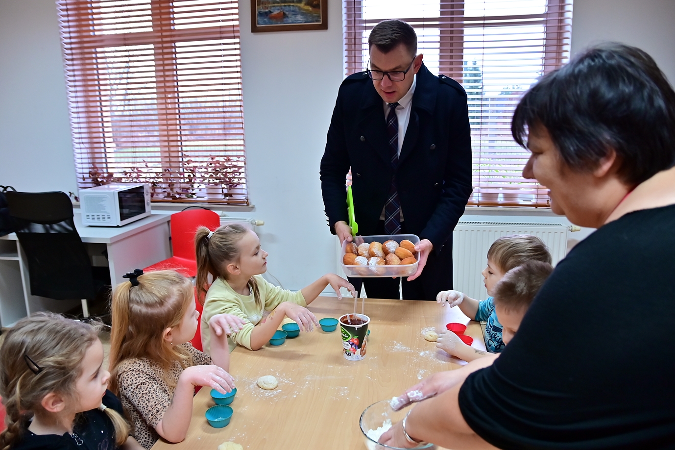 Nie inaczej było w Dworek Koćmierzów, gdzie od samego rana trwały warsztaty pieczenia pączków. W Dworku gościliśmy dwie grupy Przedszkolaków z Przedszkola nr 5 w Sandomierz, które dotarły do nas nowo otwartą linią autobusową nr 6! Gościem specjalnym porannych warsztatów był Burmistrz miasta Sandomierza – pan Marcin Marzec.