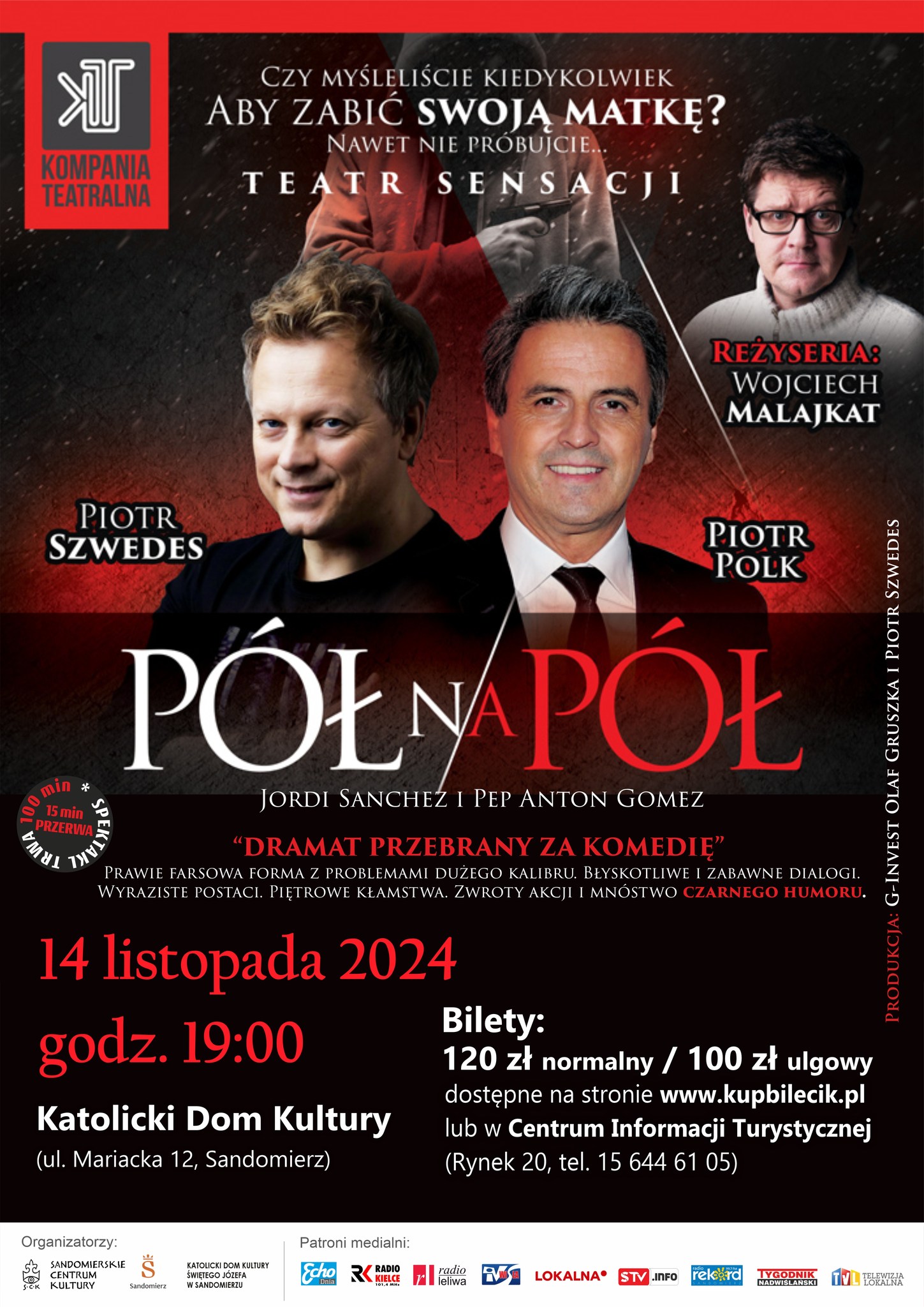 ZaproszenieGorąco zapraszamy Państwa na spektakl pt. „Pół na pół” – wyjątkową sztukę, która zabierze Was w emocjonalną podróż w świat relacji międzyludzkich. Znakomici aktorzy: Piotr Polk i Piotr Szwedes zagwarantują Wam mnóstwo wzruszeń, śmiechu i niezapomnianych chwil!