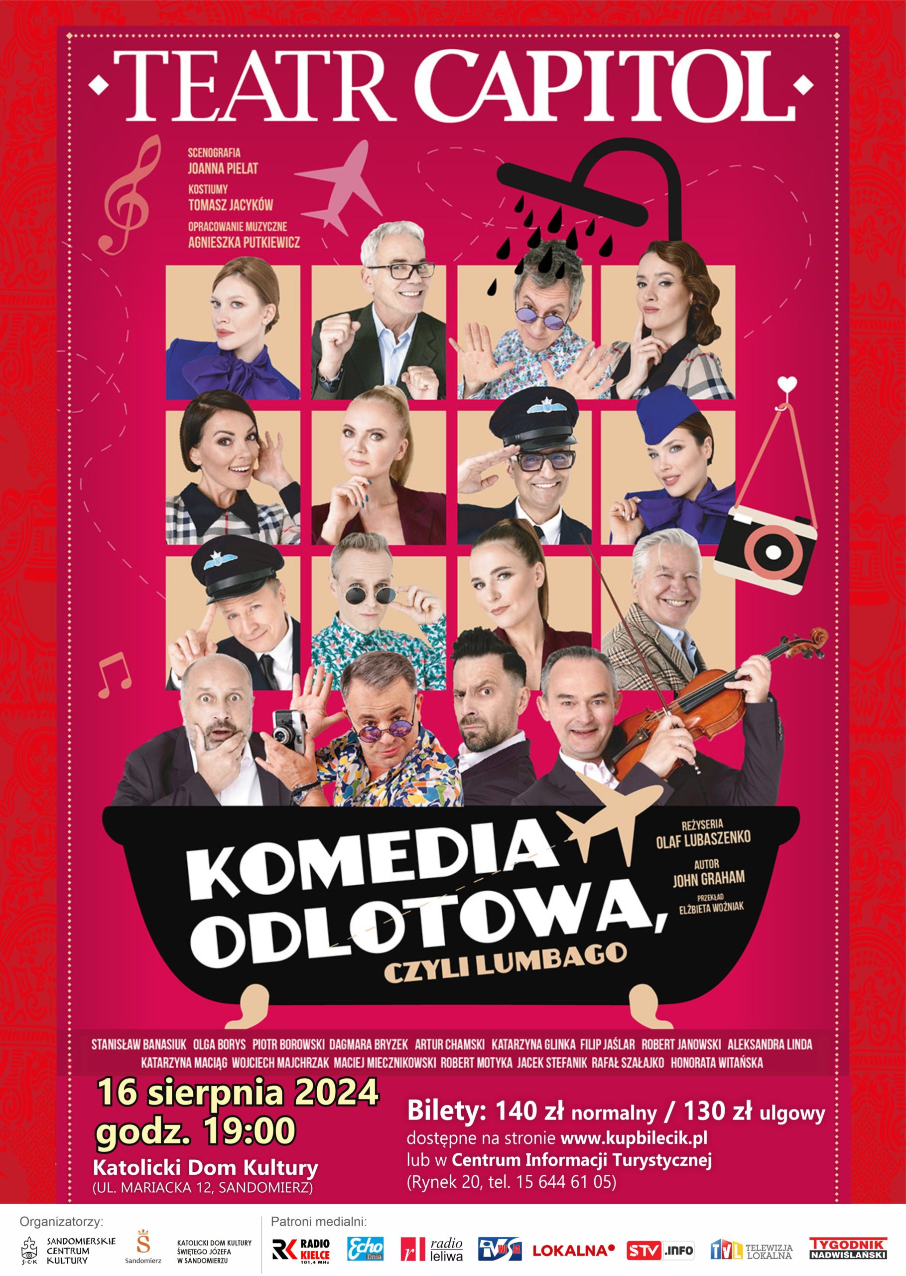 Serdecznie zapraszamy na absolutnie fantastyczny spektakl pt. „Komedia odlotowa, czyli lumbago” w wykonaniu znakomitych aktorów Teatru Capitol w Warszawie. Czujemy się wyróżnieni, że to właśnie nasze miasto zostało wybrane jako jedno z kilku w Polsce, do którego Teatr Capitol przyjedzie, aby wystawić swój repertuar.