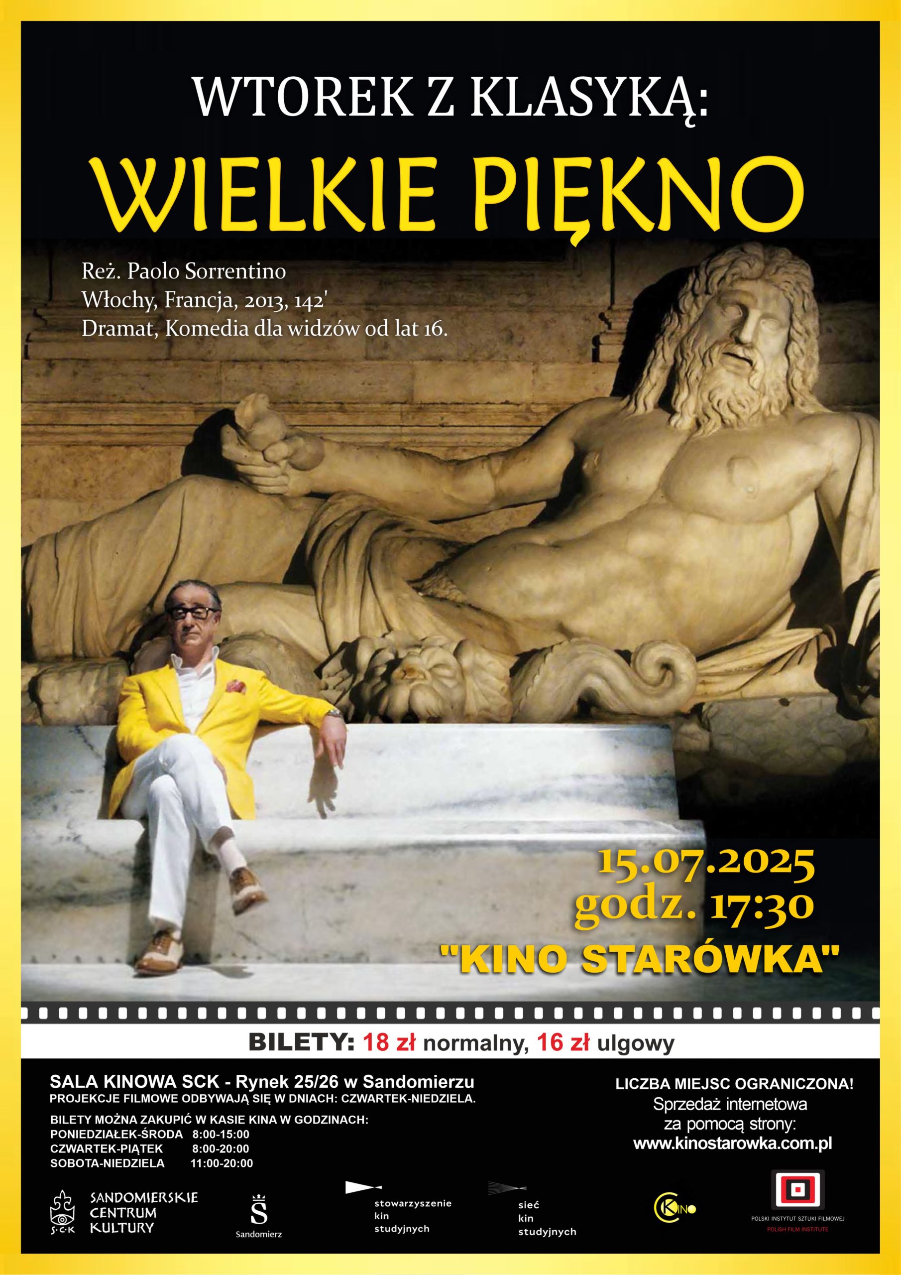 już 15 lipca 2025, we wtorek, zapraszamy na film reżysera, którego najnowsze dzieło „Bogini Partenope” zachwyciło krytyków i widzów na całym świecie. Teraz powracamy do jednego z jego najwybitniejszych filmów – „Wielkiego piękna” (La grande bellezza).