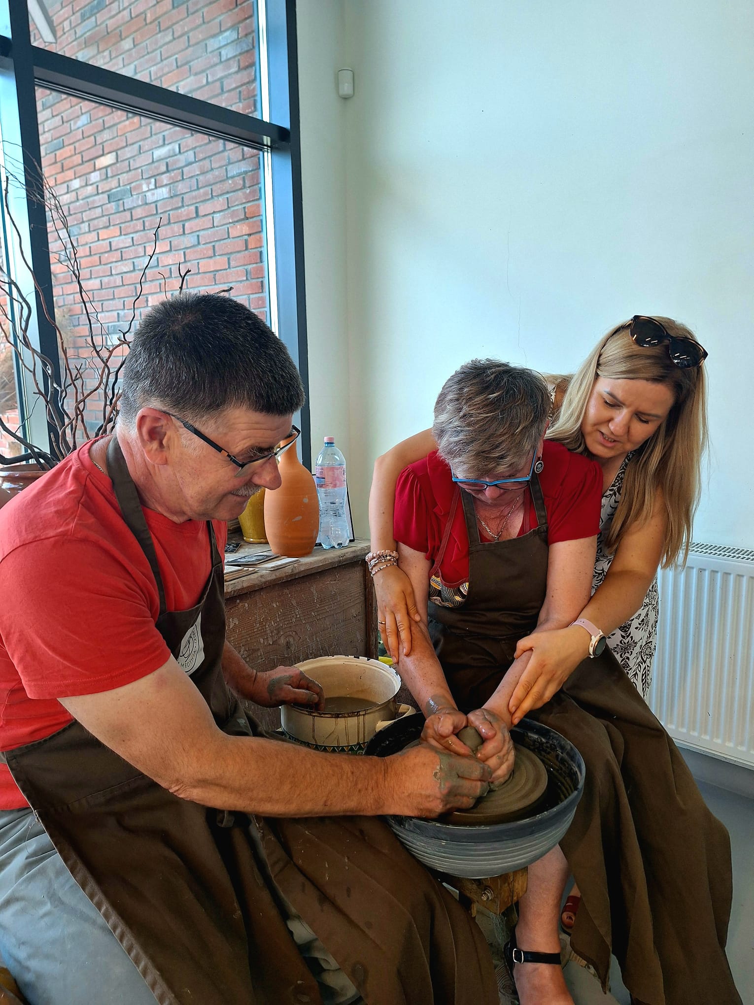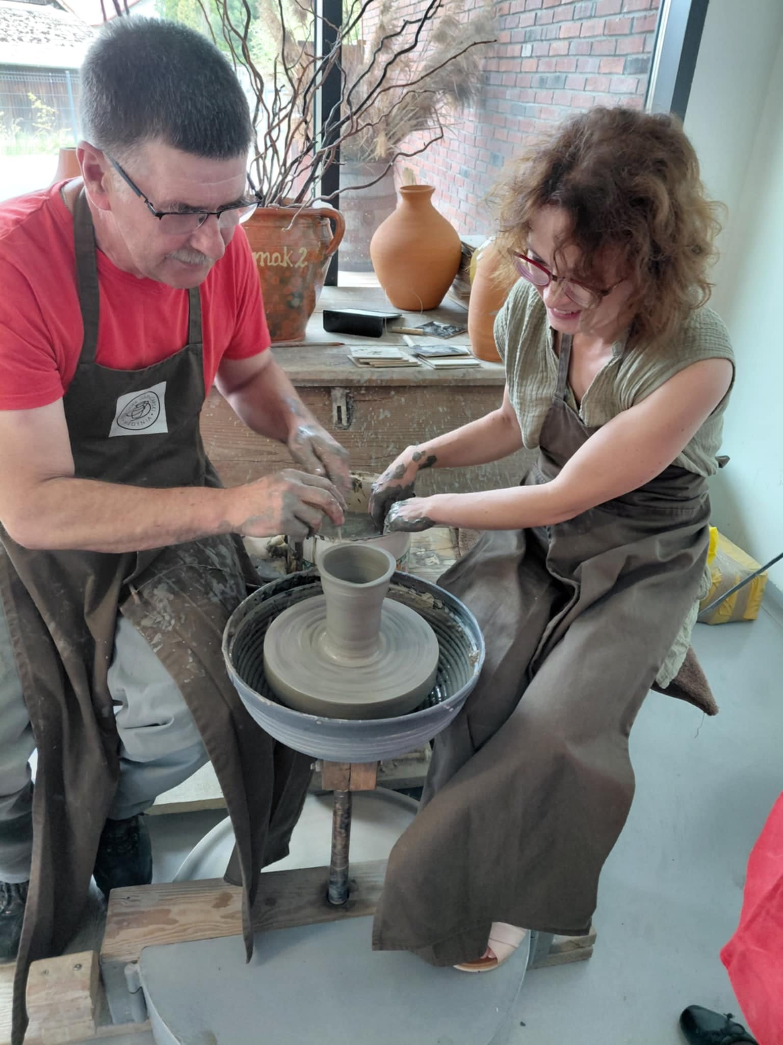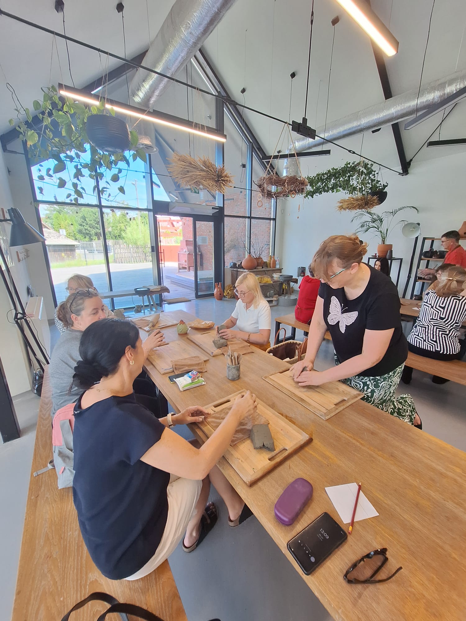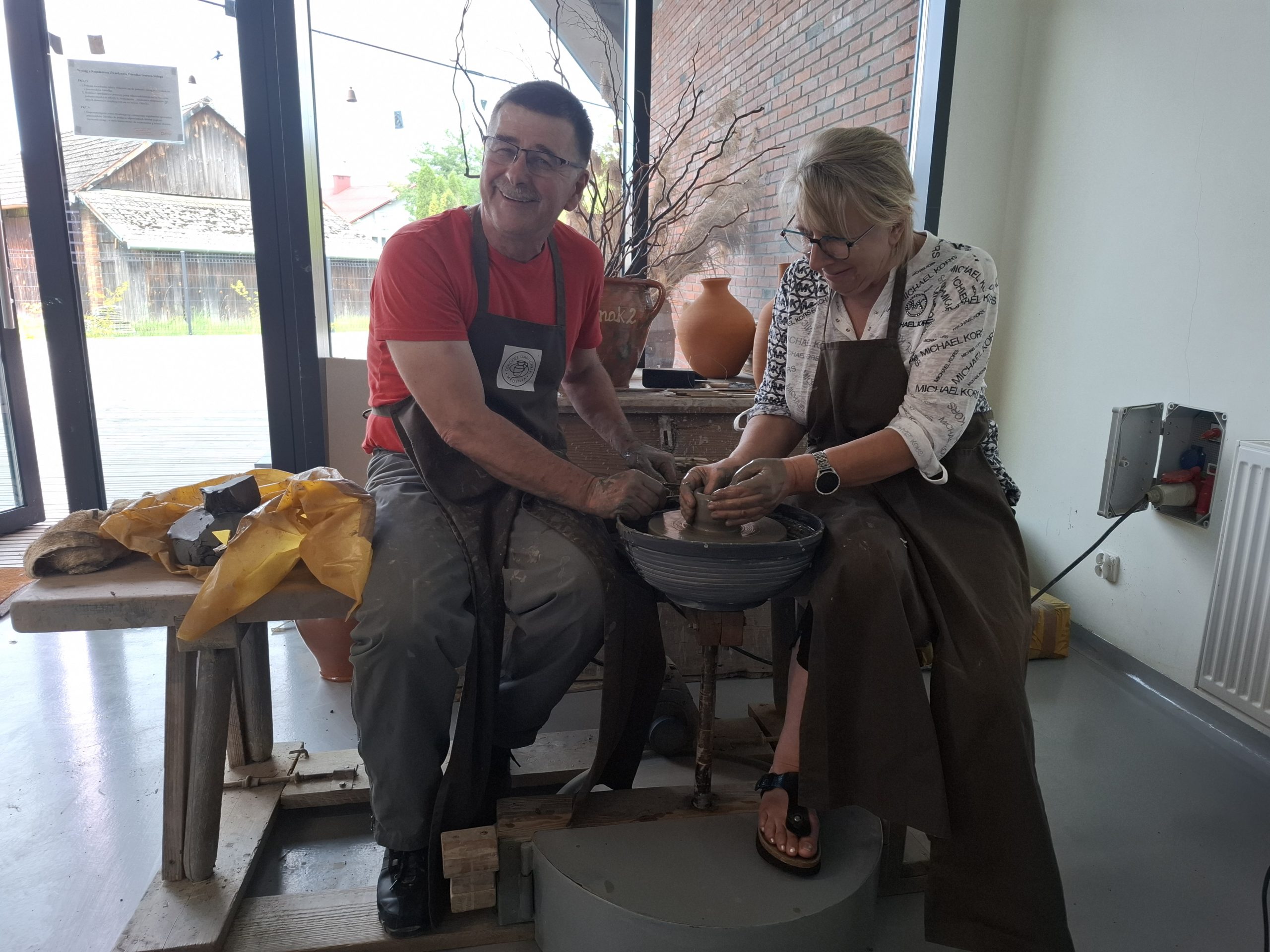 Ten dzień był prawdziwą ucztą dla zmysłów i wyobraźni! Wizyta studyjna rozpoczęła się od pełnej emocji gry terenowej, która pozwoliła lepiej poznać historię tego miejsca oraz nazwy poszczególnych wyrobów ceramicznych, stosowanych dawniej na wsi. Zaraz potem, pod czujnym okiem pana Janusza – mistrza garncarskiego fachu, uczestnicy poznali tajniki pracy na kole garncarskim i samodzielnie lepili przedmioty z gliny.