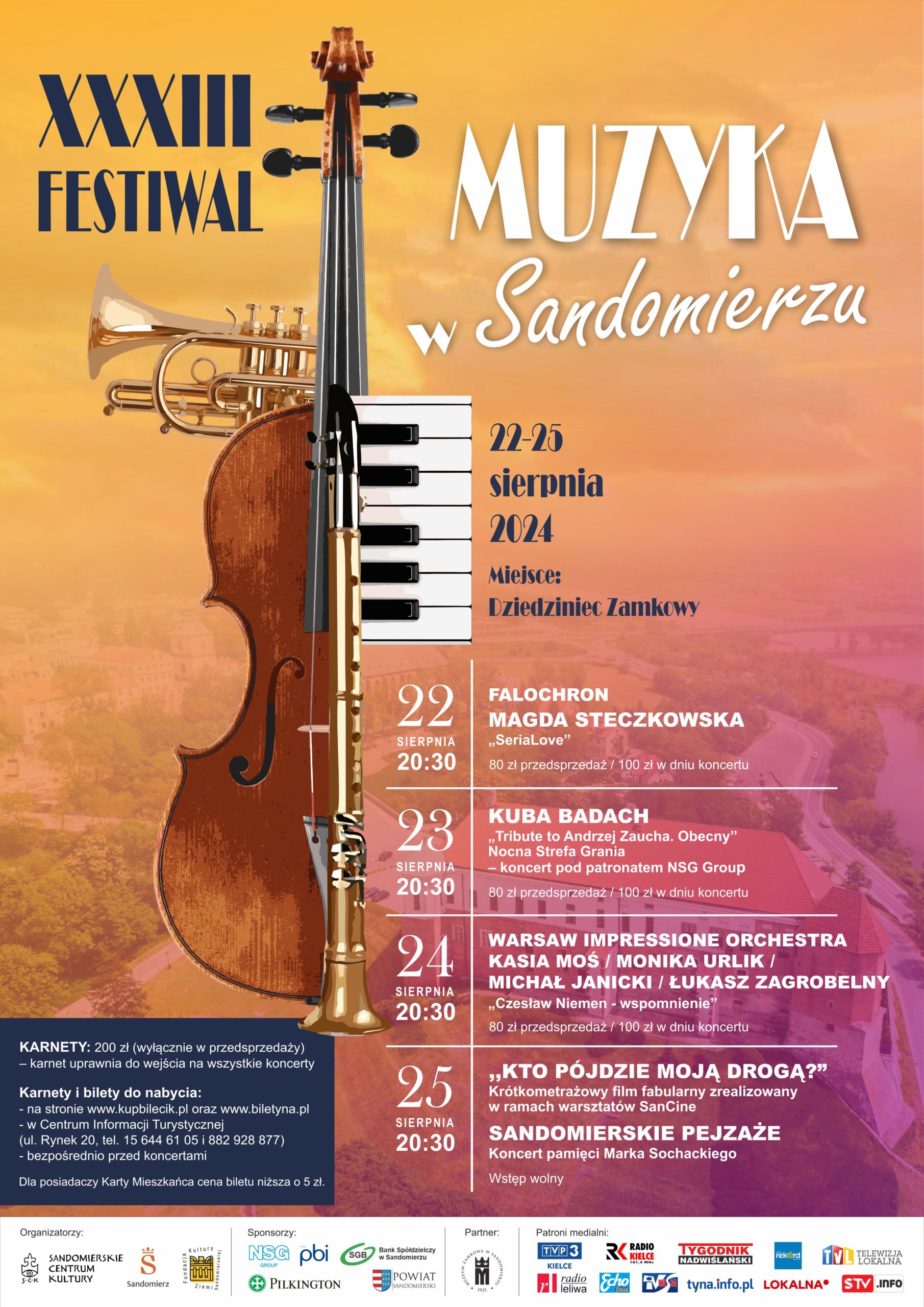 Podwójne ”3” to piękna i wyjątkowa liczba, tak też więc zapowiada się XXXIII edycja Festiwalu Muzyka w Sandomierzu! W sierpniu 2024r. czekają nas kolejne cztery dni, kolejne cztery koncerty i kolejne cztery okazje do niezwykłych spotkań, na które serdecznie zapraszamy wszystkich miłośników dobrej muzyki na najwyższym poziomie. Wszystkie koncerty odbędą się na scenie na Dziedzińcu Zamkowym przy Muzeum Zamkowym w Sandomierzu.