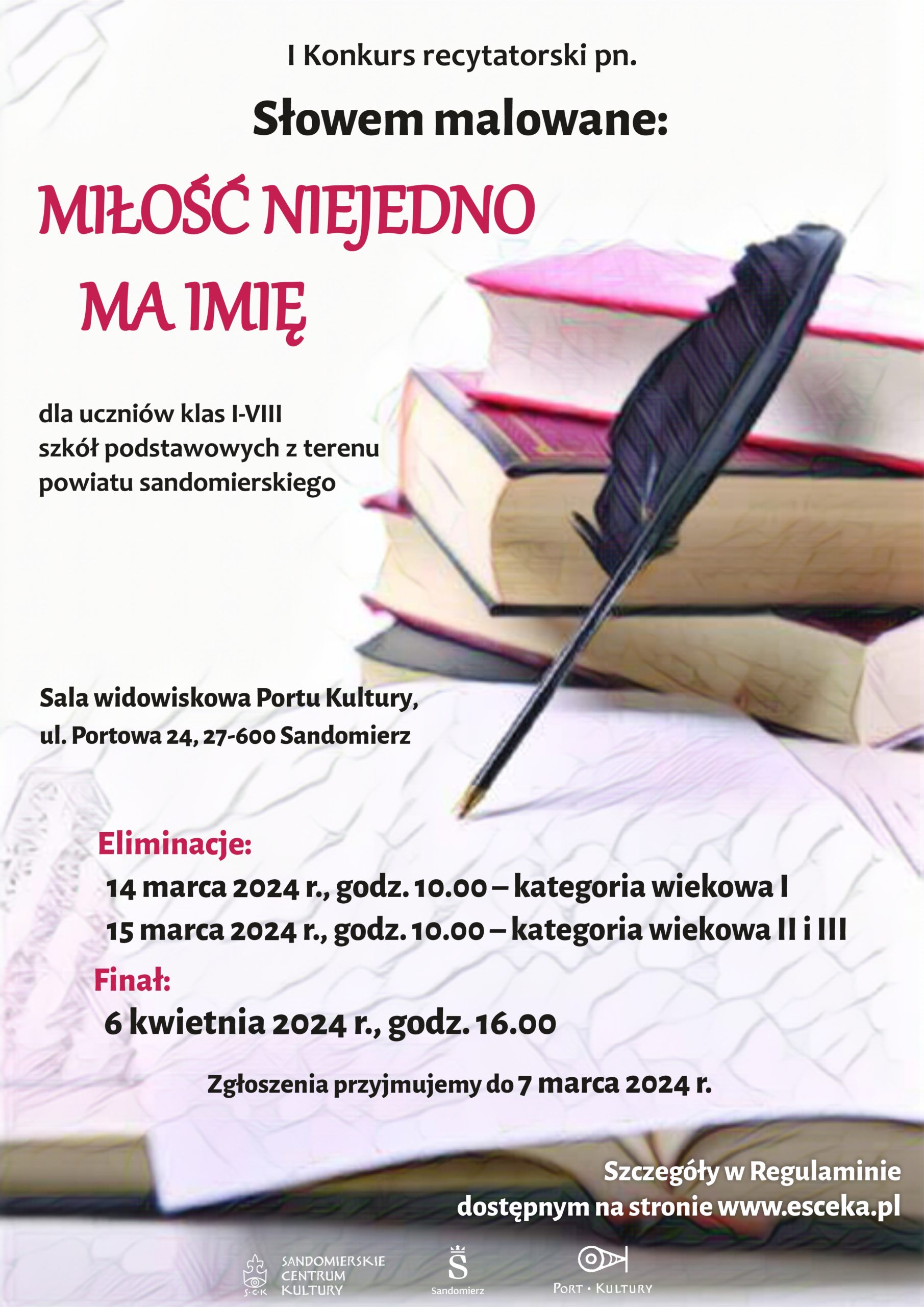 Sandomierskie Centrum Kultury oraz Marcin Marzec, burmistrz Sandomierza, zapraszają do udziału w I Konkursie recytatorskim pn. „Słowem malowane: Miłość niejedno ma imię”. Konkurs skierowany jest do uczniów klas I-VIII szkół podstawowych z terenu powiatu sandomierskiego.