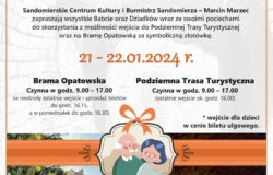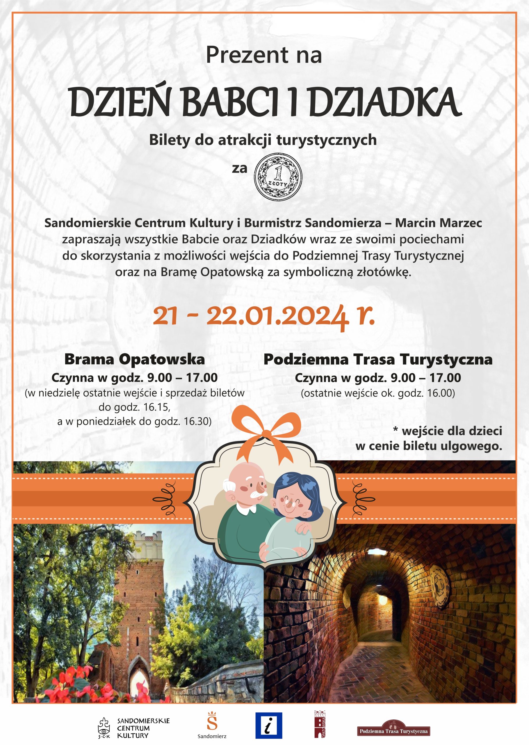 Wraz z burmistrzem Sandomierza, panem Marcinem Marcem, bardzo serdecznie zapraszamy wszystkie Babcie, Dziadków oraz ich Wnuczęta do skorzystania z turystycznej oferty na 21 i 22 stycznia br. – w tych dniach będzie można zwiedzać Podziemną Trasę Turystyczną oraz Bramę Opatowską za symboliczną złotówkę (wejściówka dla dzieci w cenie biletu ulgowego).